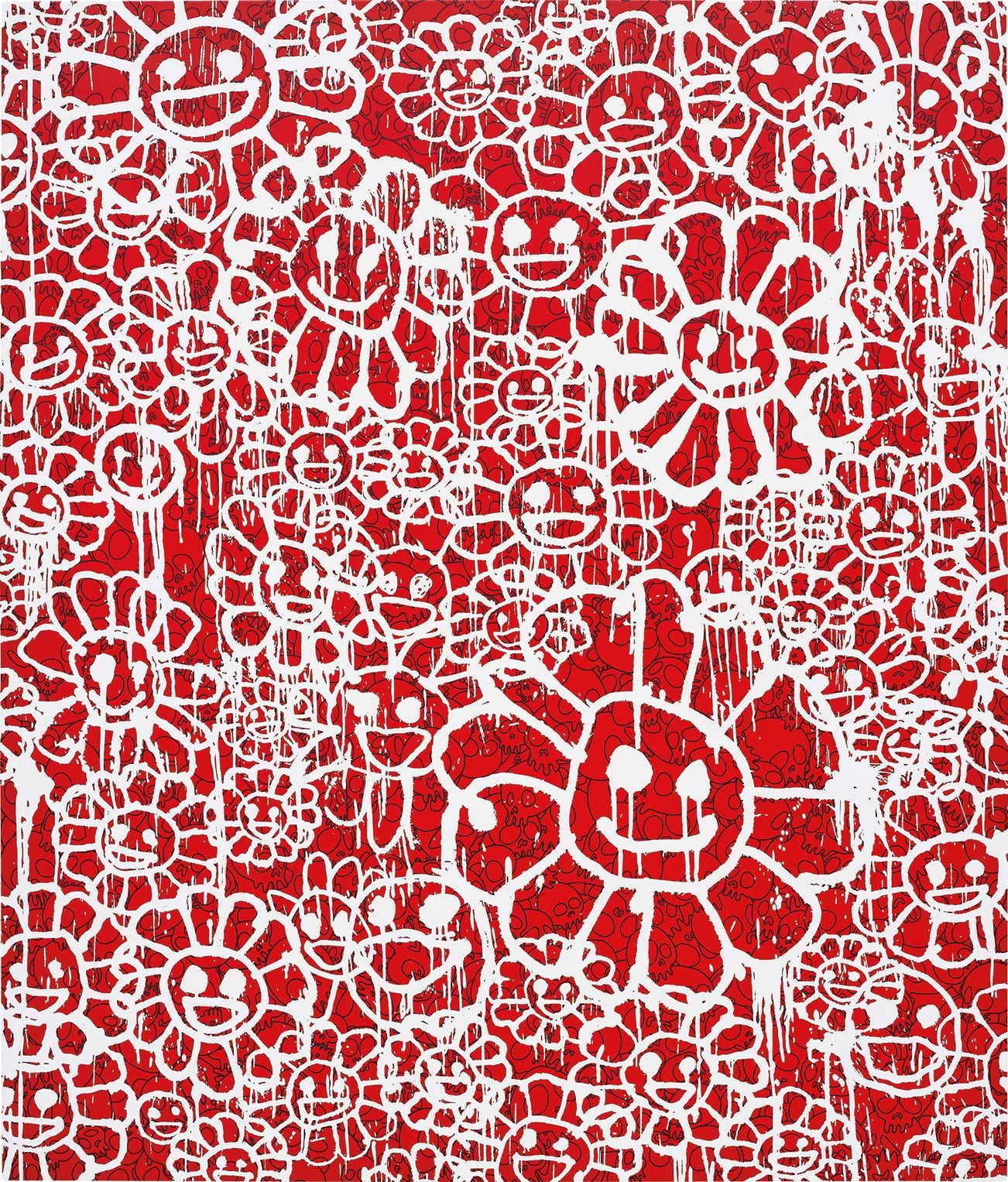 Now colleagues at Kaikai Kiki, Murakami’s own modern day Warhol factory, Murakami claims that despite their cultural differences, once they began to work together he fell “in love with [the] part of [Madsaki] that is an artist”(Takashi Murakami, 'Madsaki: Here Today, Gone Tomorrow.' in A Message from Takashi Murakami, 2017, online). On a bold red background, Murakami’s daisies are painted by Madsaki in stark white. Madsaki’s signature smiley faces appear on each one, patterning the canvas with drips of paint, conveying the frenetic energy of graffiti. This work is recognizably Neo-Pop, whilst still highlighting each artists’ individual style. This aesthetic cohesiveness is a testament to the chemistry between these collaborators.