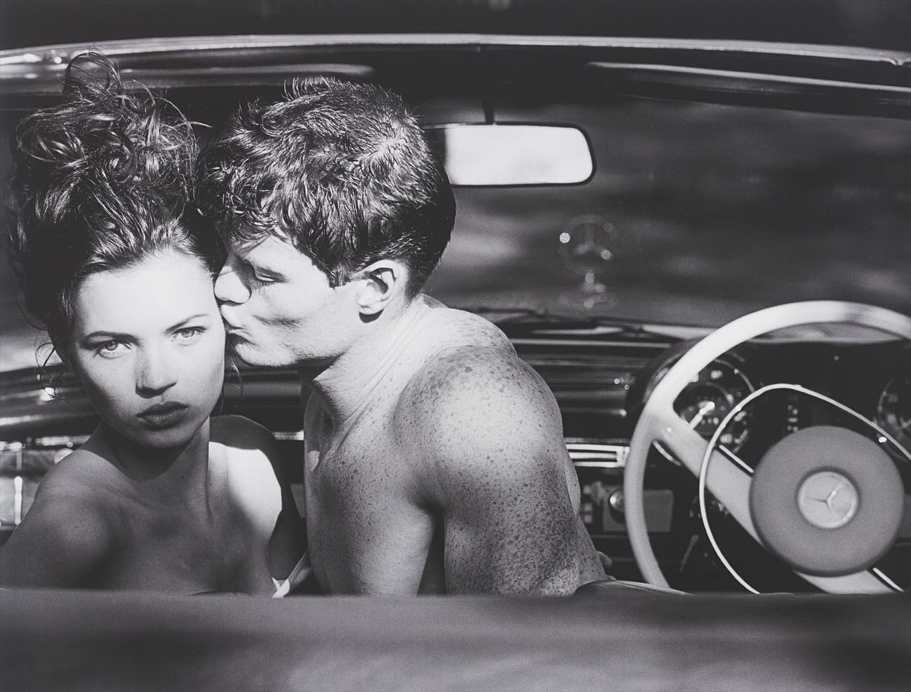 Officially McGee was commissioned to shoot a photo story with Italian boxer, Luke Massey for Italian Men’s Vogue. At the last minute, Storm model agency contacted him and asked if he would see their young signing - the 15 year old Kate Moss. She appeared waif-like and floated in amongst the photographer’s 1969 white Mercedes convertible (formally owned by the artist David Hockney) and the visceral young boxer. The fact that McGee and Kate both grew up in South London, helped the meeting to run smoothly, the chemistry flowed and they struck up a rapport. He remembers that she seemed so different from the other super models, she still had the charm of youth. Kate sat in the front seat of the beautiful machine with Massey and the seemingly effortless shots were born. When viewing this classic image, the magic produced by a fateful accidental meeting is absolutely evident.