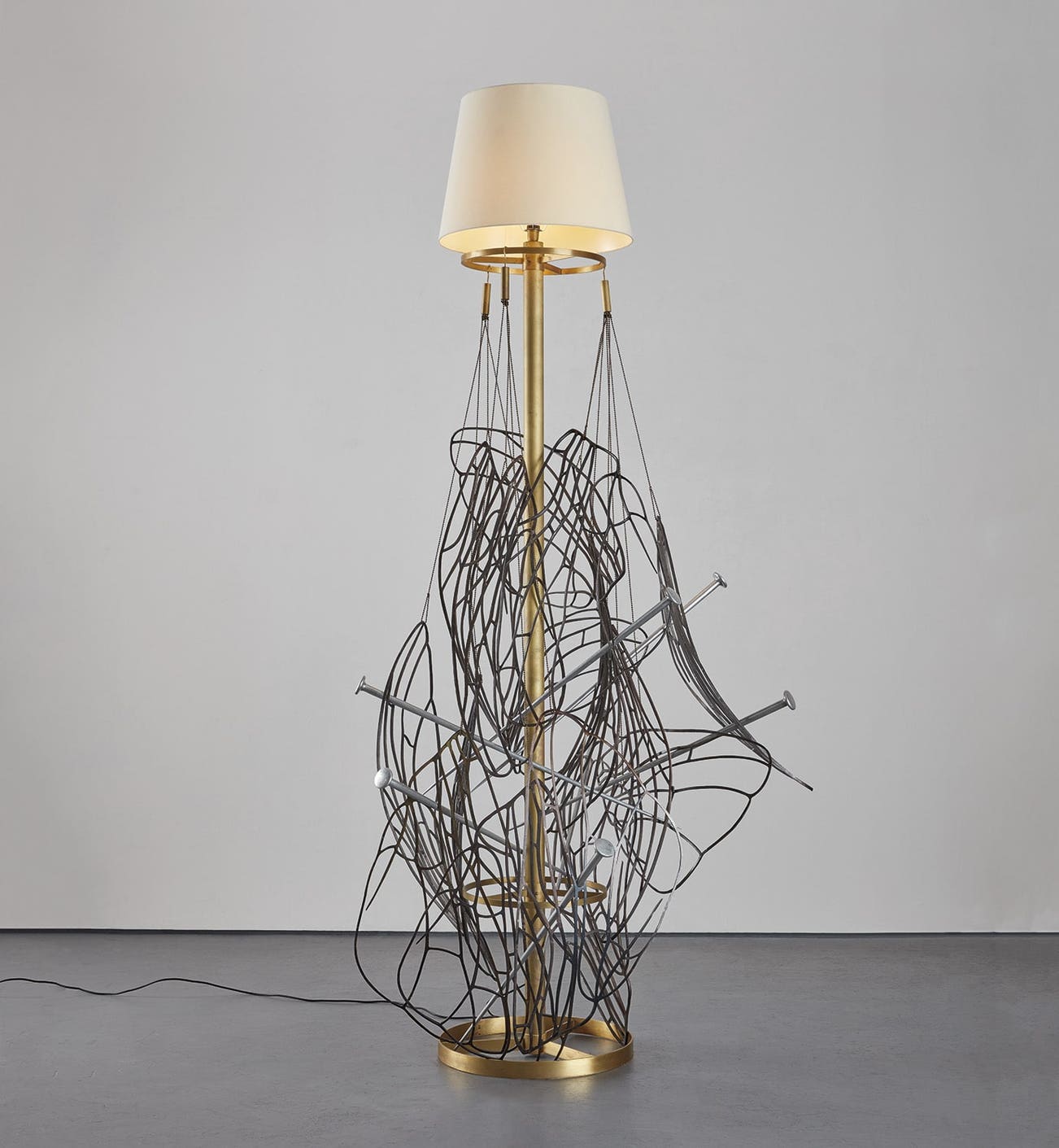 Since the 1970s, Brazilian artist Tunga worked primarily with sculpture, installation, and performance art, inviting viewers into a continuous dialogue with his practice. His artworks are intentionally enigmatic, meant to confound viewers and, in turn, probe new meanings and ideas, which for the artist become embedded within the pieces themselves. In his sculptures, Tunga draws upon Surrealism as a primary influence, juxtaposing familiar objects in mysterious, often unsettling ways. Revolution, executed in 2007, reveals such influences and, in doing so, engages the viewer at the delicate border between the real and the imaginary. A tall, standing lamp exists at the core of the sculpture, swathed in a tangled web of seemingly unidentifiable forms. Upon closer examination, this web reveals itself as larger-than-life insect wings, oversized pins, and hanging chains, arranged in a frenzy of opposing elements.