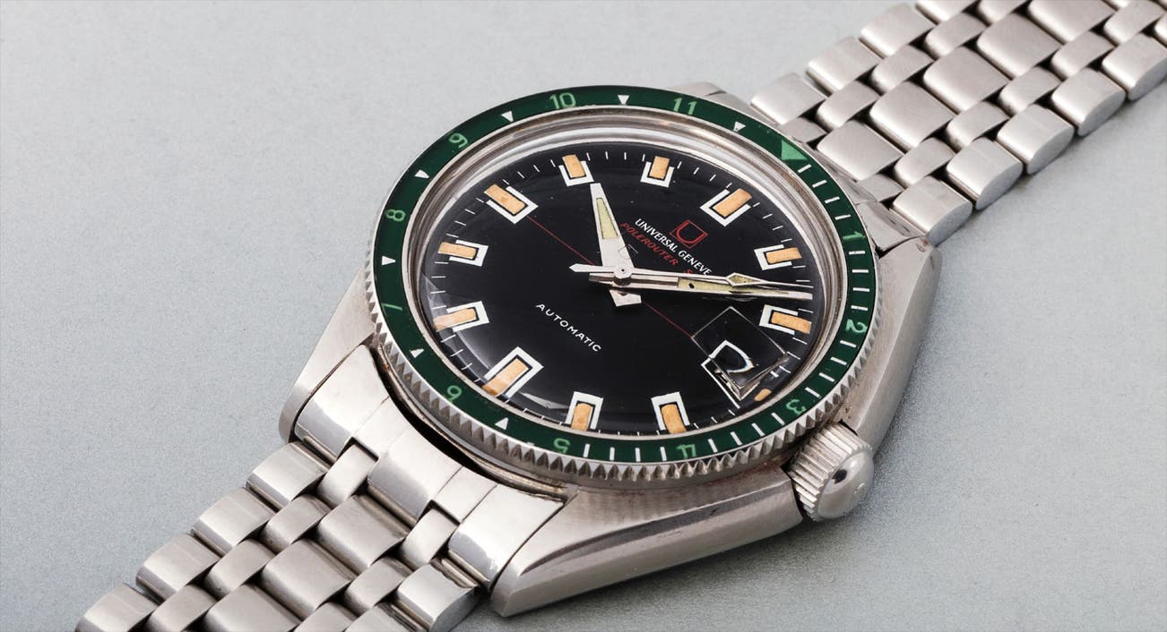 Universal Genève created many variations of the celebrated Polerouter model. The present example is known as the Polerouter Sub, a diving watch that is distinguished by its rotating green bezel. This watch remains in pristine condition roughly 60 years later with sharp edges and clearly visible hallmarks and stampings, and is sure to please collectors with all different levels of experience.