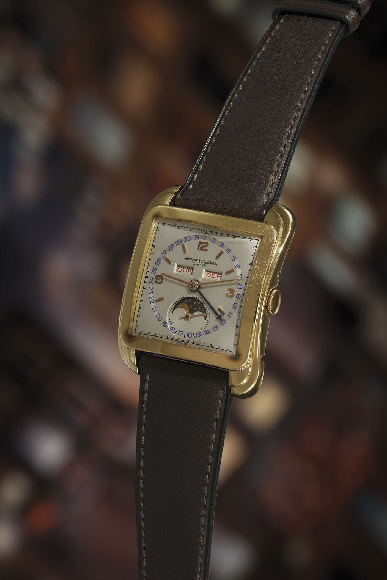 Dramatically oversized, and with its sensual and graceful curves, the design was far ahead of its time. Its iconic status was further illustrated when Vacheron Constantin reintroduced the model in 2003, with a modernized triple calendar with moon phase named the “Toledo 1952”. The present “Cioccolatone” is, without a doubt, the finest and best-preserved example of the reference 4764 triple calendar moon phase known to exist,one of less than a handful known in pink gold. It comes to auction having last been seen in public in 2006. In breathtaking original condition, the unpolished, hardly ever worn case retains its original factory finishing throughout as well as its crisp hallmarks on the underside of the lugs. The two-tone silver dial is immaculate and totally original, as delivered by the factory in 1958. This reference 4764 impresses by its sheer presence and unusual organic shape. Featuring Vacheron Constantin’s largest and most extravagant case of the era, cased in the model’s rarest and most prestigious metal –18 karat pink gold, and fitted with the most exclusive version of the model with triple calendar and moon phase, this reference 4764 is certainly one of the most important and desirable Vacheron Constantin wristwatches to be offered at auction in recent memory. It is a must have timepiece for any collector of watches from the golden age of wristwatch design and manufacturing, and a true trophy watch for the world’s finest collections.