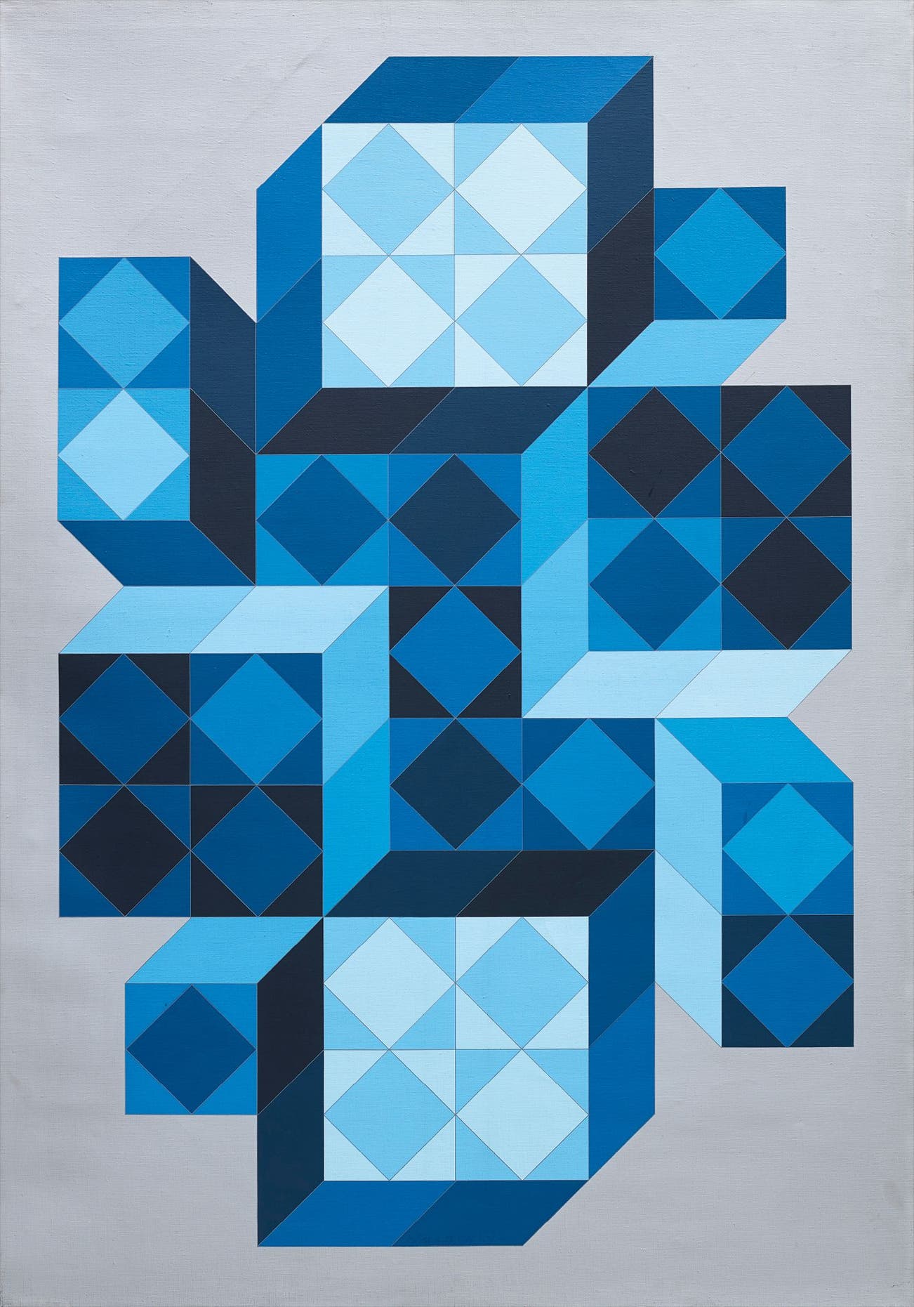 Crystalline and coursing with vital energy, Vasarely’s 1972 work, Tridim-Kek, is exemplary of the artist’s persistent exploration of colour and form to create the appearance of three-dimensionality. Combining the techniques developed in his progressive Alphabet Plastique and 1969 Gestalt series’, Tridim-Kek demonstrates the artist’s preoccupation with manipulating small units of colour, encased in geometric forms, which are repeated and contrasted to create a snake-like movement throughout the work. Deep cobalt, sapphire and azure blues provide a patchwork of tonal relationships, provoking the viewer’s eye to wander over the rhythmic motion of the central form. Contrasting highlights of triangles, diamonds and parallelograms offer structural harmony to the suspended celestial form. Conveying the geometric composition of a snowflake, in Tridim-Kek Vasarely seeks to channel both the rigidity of science with the spontaneity of nature to achieve formal and tonal harmony.