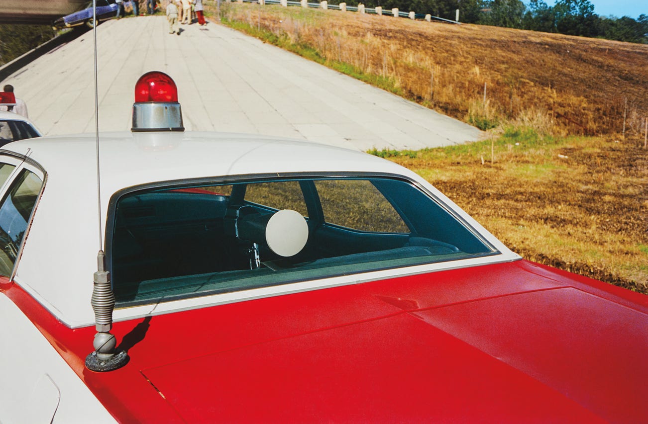 Eggleston shows us that there is nothing more elaborate or beautiful than the rich, material complexity of the unassuming everyday built environment. In Untitled, 1971-1974, bold colors, shapes, and planes intersect and repeat, forming a dynamic, almost Kandinsky-like Modernist composition from the not uncommon scene on the American highway system—police and bystanders congregated around a minor car accident. Rather than taking a photo-journalistic stance, Eggleston stands away from the scene on the distant overpass, eschewing any details that might provide circumstantial context, creating instead, a vivid study of color and form. In the present lot’s striking, large-scale presentation, we experience the full force and brilliance of Eggleston’s arresting composition.