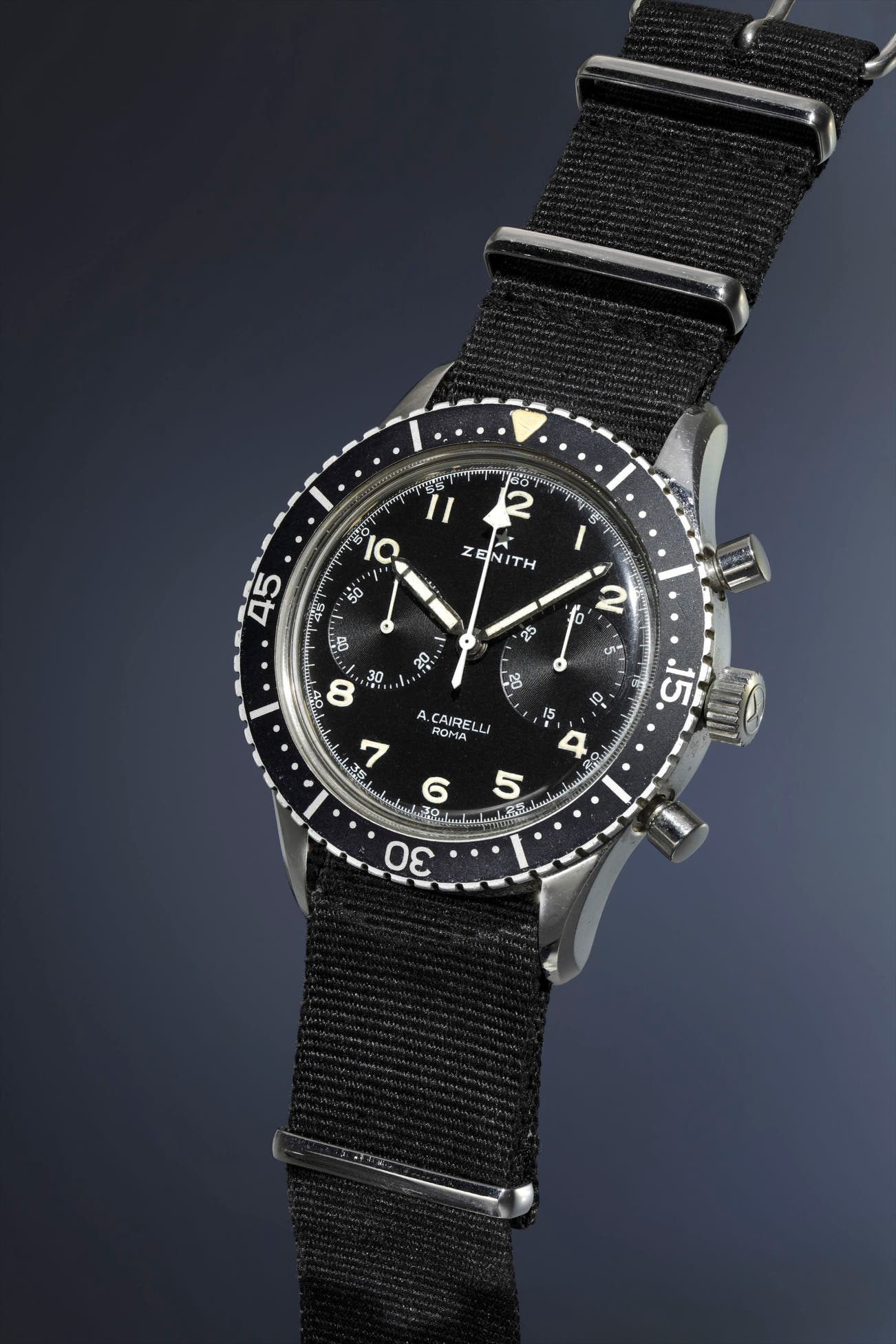 They were all supplied through A. Cairelli, the prominent Roman retailer of watches, clocks, and mechanical instrumentation. Designed for AMI’s pilots for mission use, many were not issued due to an abrupt cancellation by the AMI. A. Cairelli sold the remaining stock – all with no military inscriptions on their casebacks – privately to civilians.