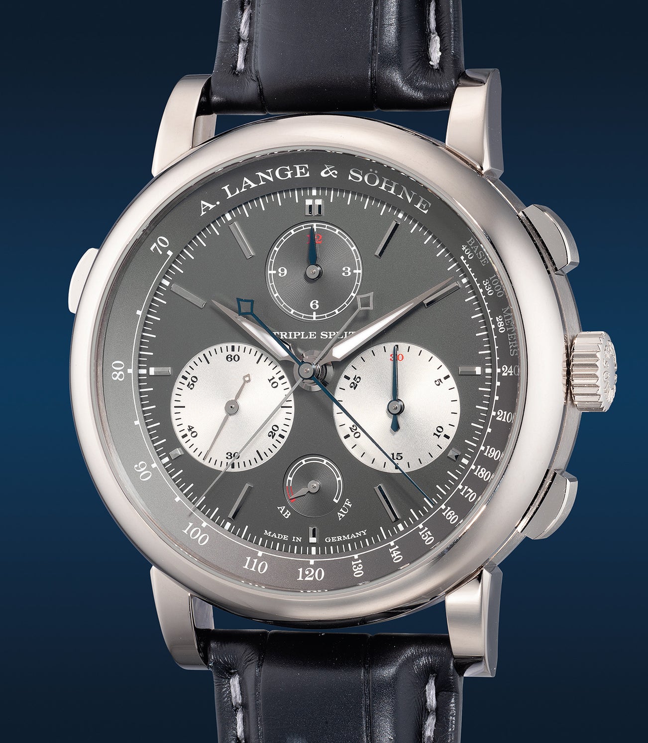 A rare, impressive and highly attractive white gold triple split chronograph wristwatch with power reserve indication, guarantee and presentation box, numbered 75 of a limited edition of 100 pieces
