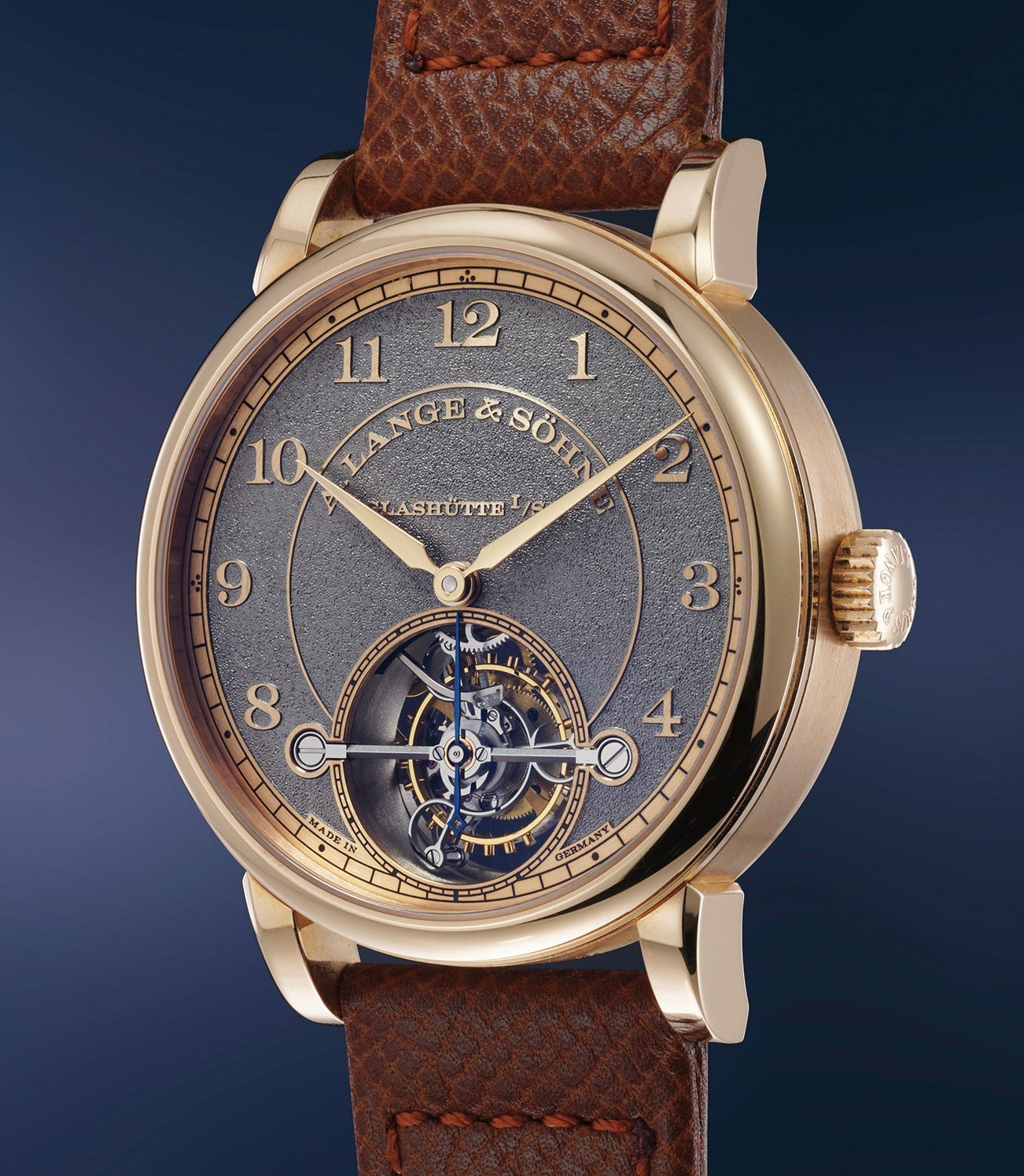 With the granular texture of the dial, Lange forged a new vision of art and craftsmanship. The rhodium plated pink gold dial is hand engraved by a special burin resulting in an effect called “tremblage”. The A. Lange & Söhne logo and the numerals are further hand cut in relief and then mirror polished. It takes a full two weeks of painstaking hand work to engrave just one dial.