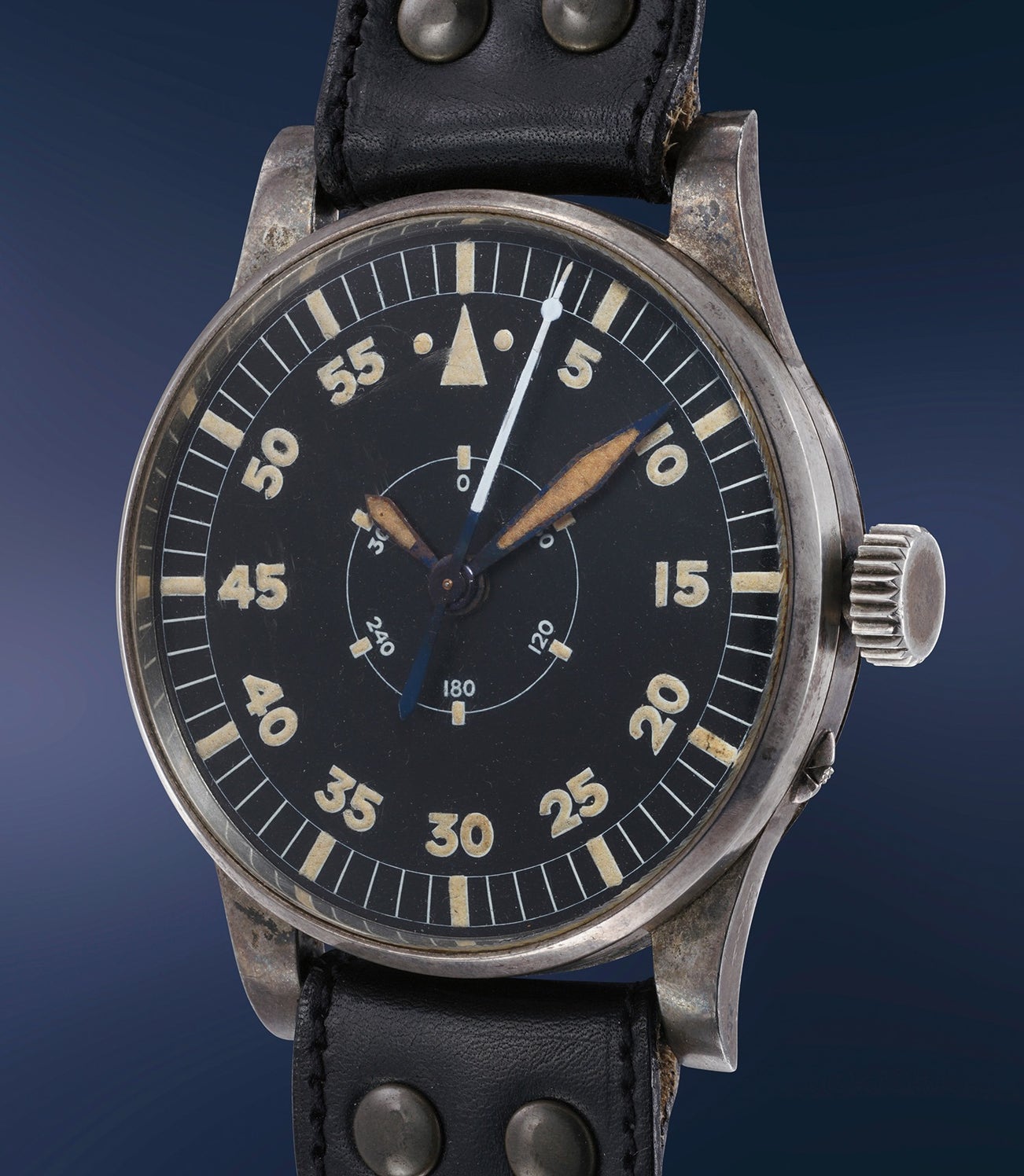 One of the consequences of such developments was the need for more and more precise navigation instruments, and - thanks to inputs from Lindbergh himself together with other aviation legend Philip Van Horn Weems - a number of specific timepieces were developed. Without a doubt, the most rare among vintage aviator’s timepieces are those featuring “hour angle” dial, such as the present piece. These watches present time in degrees (rather than in minutes). As the earth is round and revolves once a day, the center indicator for the “hour” hand is divided in 360 degrees - the hand revolving once a day - and the outer track (“minute” hand) indicates the additional degrees to add to what shown on the central track. Minute and second hands proceed four times “slower” than on a normal watch, with one revolution every four minutes. Thus, one hour equal to 15 degrees: midday will be on this watch 180.0.0 degrees, and the “classic” 10:08:30 become 152.8.5.