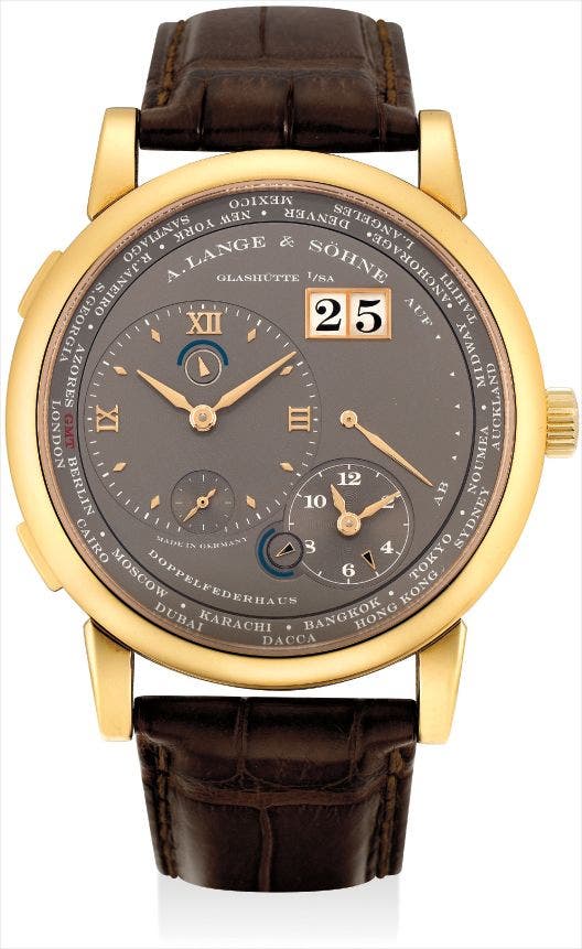 A fine and very rare pink gold dual and world time wristwatch with date, power reserve and unusual grey dial