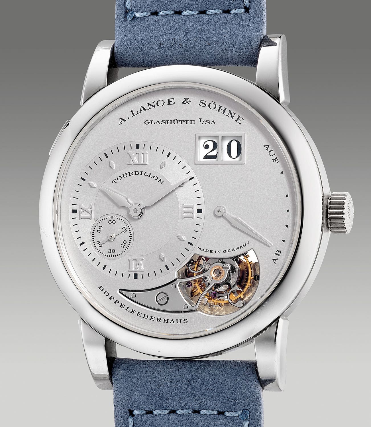 Housed inside a 38.5mm diameter platinum case is a delicate in-house movement featuring its classic ¾ plate in German silver and its meticulous hand-engraved balance cork. Composed of 378 parts with 72 individual parts for the tourbillon, the cal. L961.1 is superbly finished.