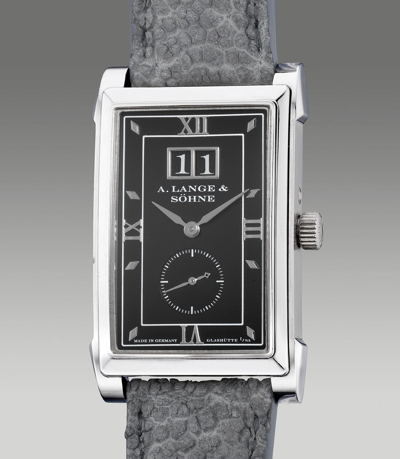 Produced as a time-only timepiece, various precious metals and dial combinations, the Cabaret lineage begun at Baselworld in 1997 with the pink gold ref. 107.031 paired with a beautiful two-tone black-silver dial. Inspired by the delightful details of the Roman numerals from Lange 1, and the diamond shaped indexes from the early Saxonia model, the present example of the ref. 105.035 in platinum with a graceful brushed finish dial was launched in 1999. The combination of the dark grey dial framed by the cool of platinum radiates the appeal of the black and white era of the charming Humphrey Bogart with a merit of the modern technical finesse. Inside this gentlemen piece is the calibre L.931.3 beats at 3 Hz and offers a power reserve of 42 hours.