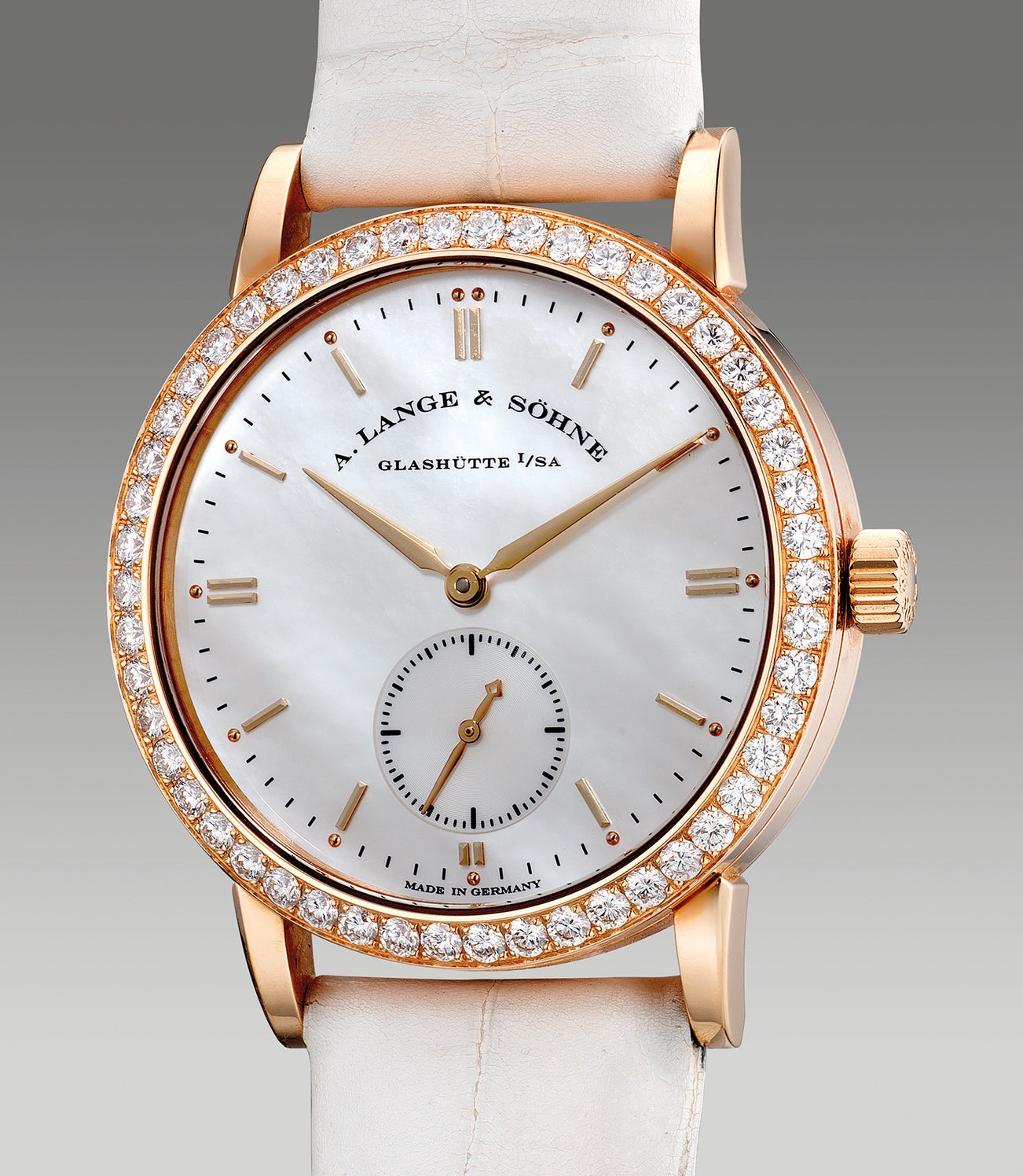 The present lady’s A. Lange & Söhne Little Saxonia in pink gold with a diamond-set bezel and a mother of pearl dial is of the smallest examples produced with a case measuring 34mm diameter. Powered by the firm’s manual cal. L 941.2, purists will surely favor the present variant over its self-winding sister models, allowing the wearer to view the highly executed and hand-engraved balance cork in full view. Offered in excellent overall condition and only believed to be worn not more than a handful of times, the present timepiece is complete with its full set of accessories.