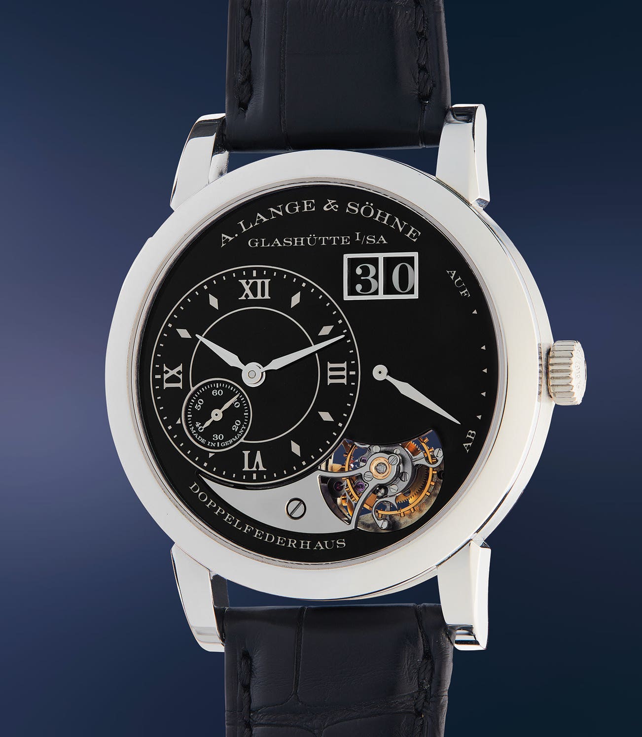 An extremely rare and sublime platinum tourbillon wristwatch with oversized date display, guarantee, and presentation box, numbered 16 of 20, commemorating the 20th anniversary of the Lange 1