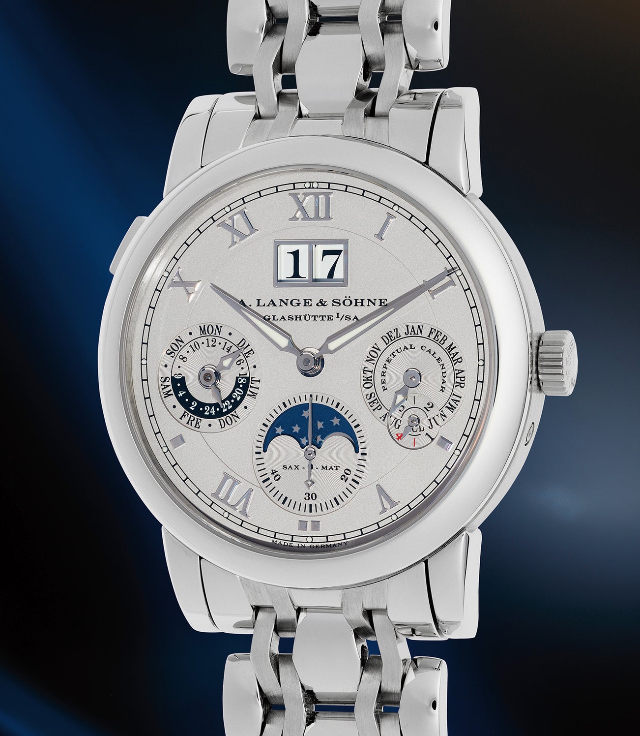 The present platinum model with rare German calendar is in excellent overall condition and comes complete with its guarantee and winding presentation box. Most strikingly, it is fitted with a superbly constructed Wellendorf bracelet that adds a completely new dimension to an already attractive watch. Very few of these Langematik Perpetuals have surfaced on this bracelet, making this a rare opportunity for the Lange enthusiasts among us.