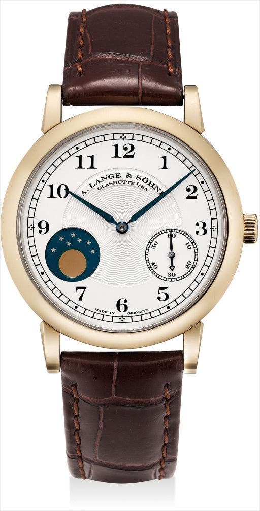 A very fine and rare honey gold limited edition wristwatch with moon phases, made to commemorate the 165th anniversary of A. Lange & Söhne in 2010