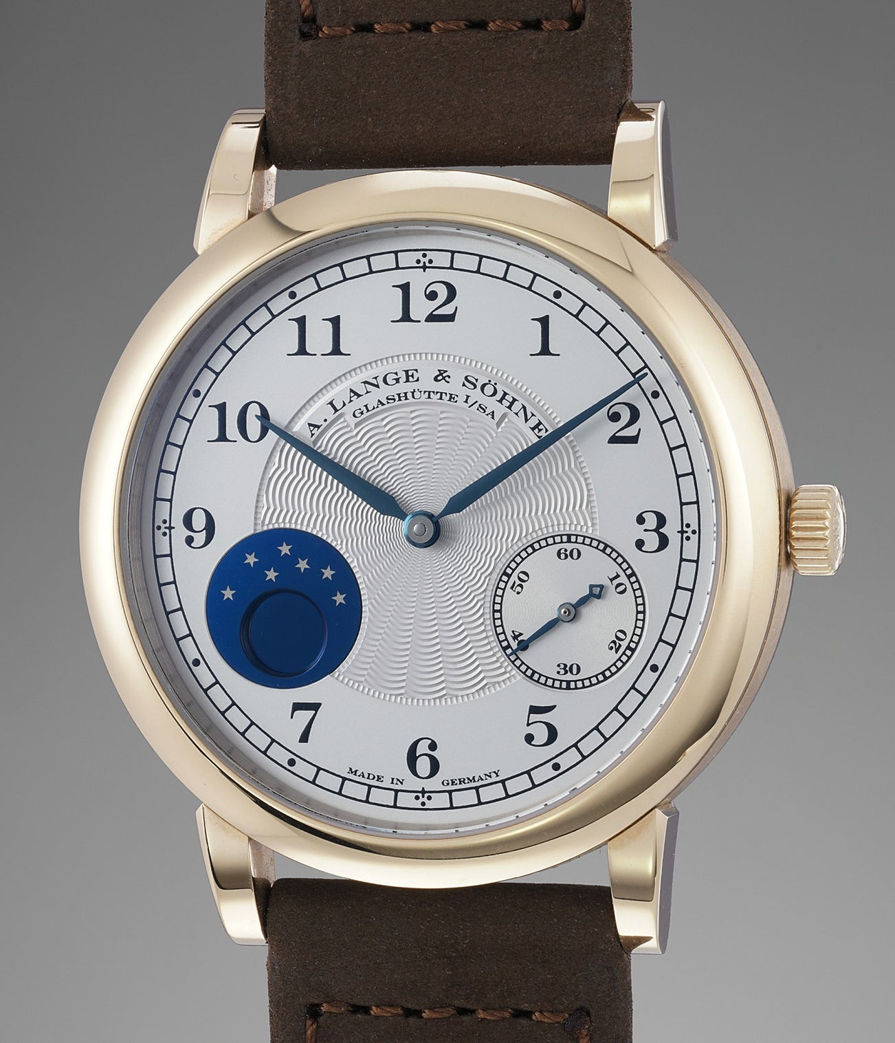 In addition to the unusual gold alloy, A. Lange & Söhne engineers developed a highly precise moonphase gear train, which would require no correction to the moonphases for 1000 years as long as the watch was kept wound. The present example, number 123, is preserved in like-new condition and is replete with all its original accessories, such as the guarantee dated November 14, 2010, setting pin, balance cock engraving authenticity paper, product literature, fitted presentation box and outer packaging.