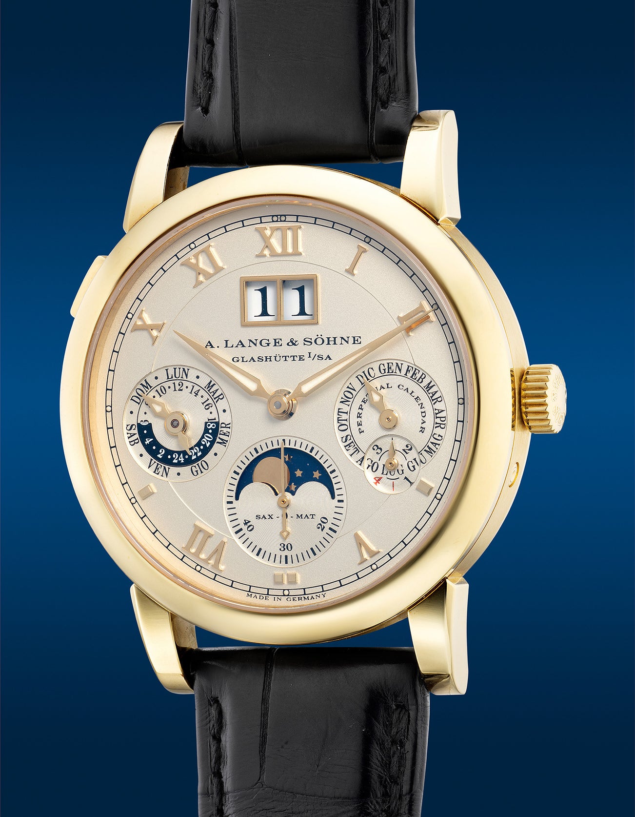 An elegant and attractive yellow gold perpetual calendar wristwatch with moon phases, 24-hour indication, leap year indication, zero-reset function and presentation box