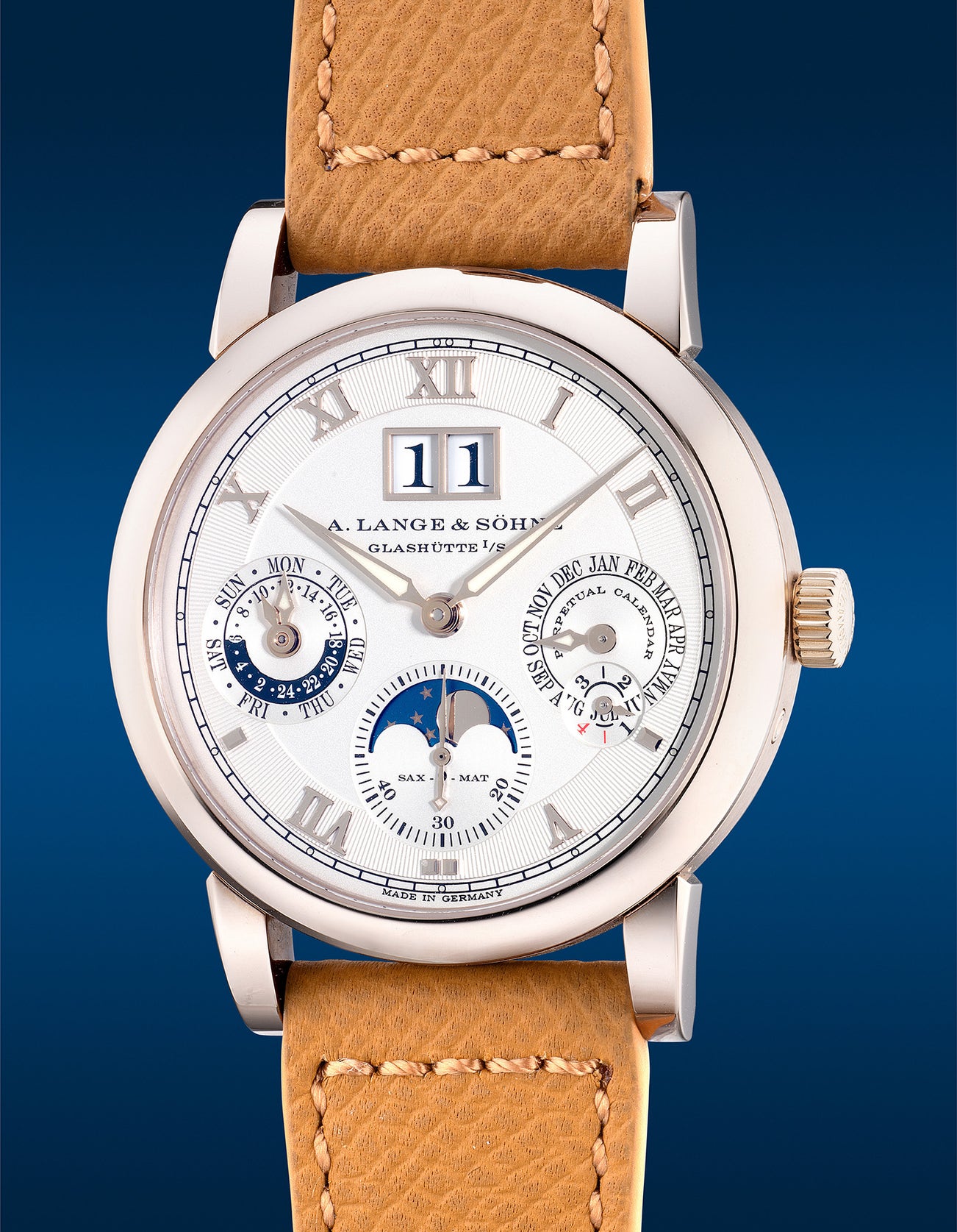 First introduced in 2001, the A. Lange & Söhne Langematik Perpetual is the firm’s first self-winding perpetual calendar wristwatch produced featuring the manufacturer’s off-centred 21K gold SAX-O-MAT rotor. Powered by the in-house cal. L922.1 with zero-reset function composed of its signature German silver, it indicated moon phases and leap year featuring its iconic oversized date display at 12 o’clock. An impressive movement, the perpetual calendar is accurate up to the year 2100 if the watch is consistently running.