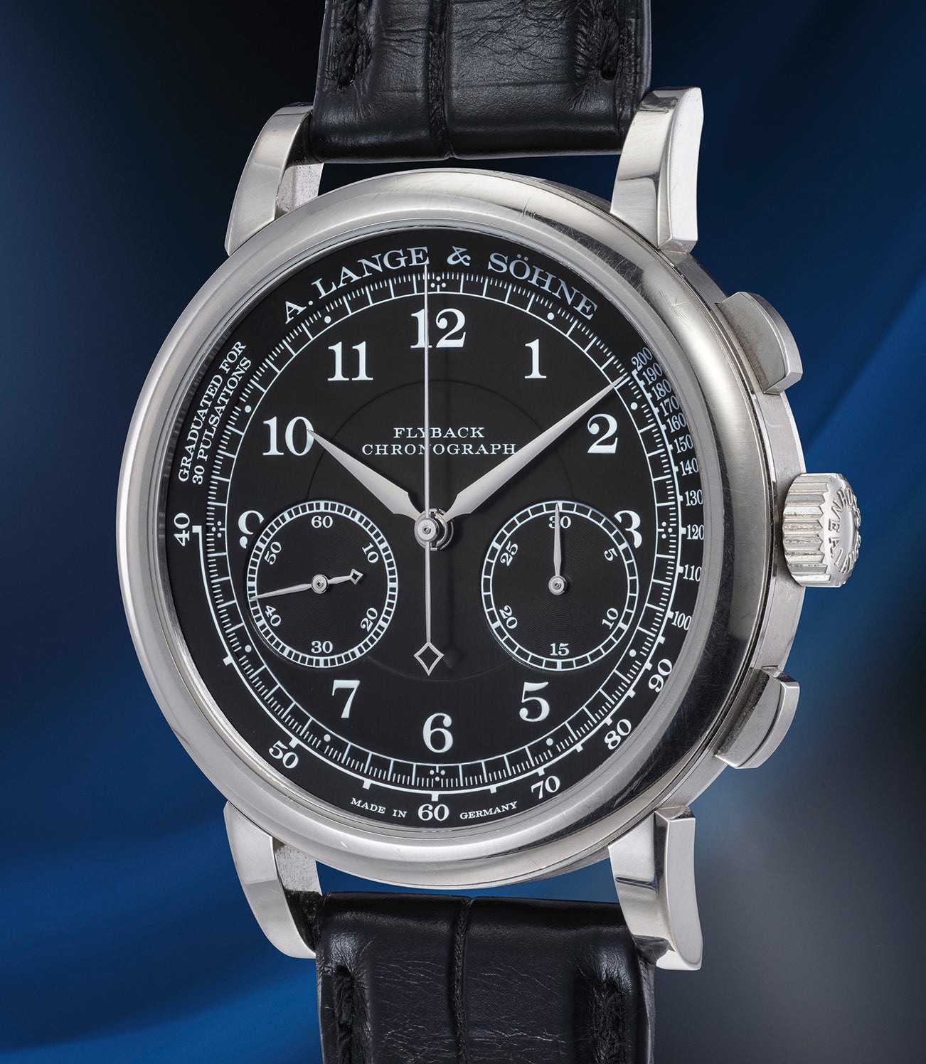 The present 18K white gold 1815 Chronograph with black dial is an early generation example produced between 2004 and 2008, and is a wonderful representation of A. Lange & Söhne's brand values. The watch combines traditional watchmaking with 21st century engineering with the caliber 951, their renowned chronograph movement first introduced in 1999 in their Datograph model. The flyback mechanism allows the hands to reset at zero for immediate new measurements.