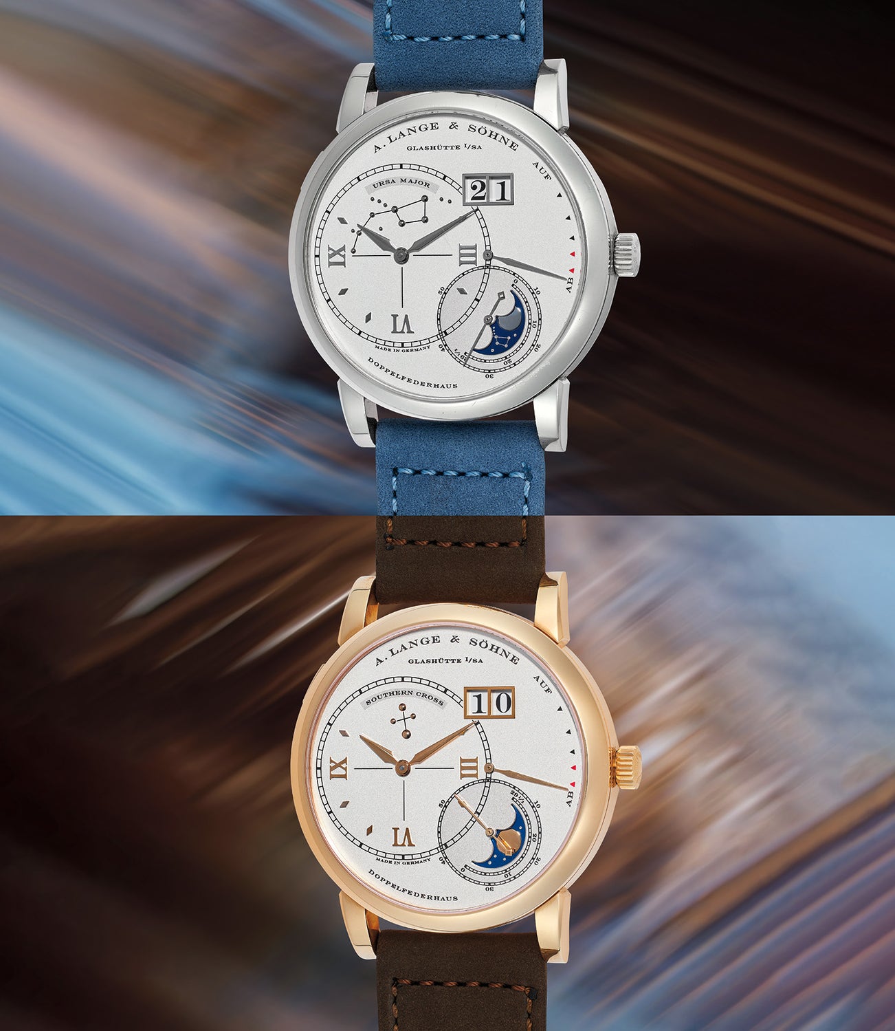 Each one of these timepieces correctly and accurately indicates the moon’s position as seen from different hemispheres. The white gold model features the Ursa Major constellation on the dial and depicts the phases of the moon as seen in the Northern Hemisphere whereas the pink gold model features the Southern Cross and depicts the phases of the moon in the Southern Hemisphere. The watchmakers and engineers at Lange devised a very accurate system for the indication of the moonphase that moves continuously (as opposed to most common versions found where the moon jumps an increment once or twice a day) and are so accurate that they need to be set once every 122 years.