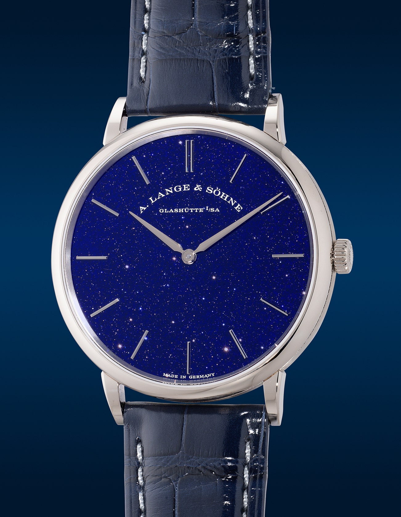 - The present Saxonia Thin introduced in 2018 features an outstanding dial that will impress watch lovers. Sparkling like a dark blue night sky, the Saxonia Thin is fitted with a solid silver dial coated with a thin layer of gold stone, also known as Aventurine glass with microscopic copper oxide crystal layered in the coating hence the name Copper-Blue. Labour intensive in the making, the Copper-blue technique dates back to the 17th century invented in Venice by the Miotti family. Combing silica and copper oxide, the mixture then goes through a heating and cooling process to get the perfect crystallization to achieve its stunning result.