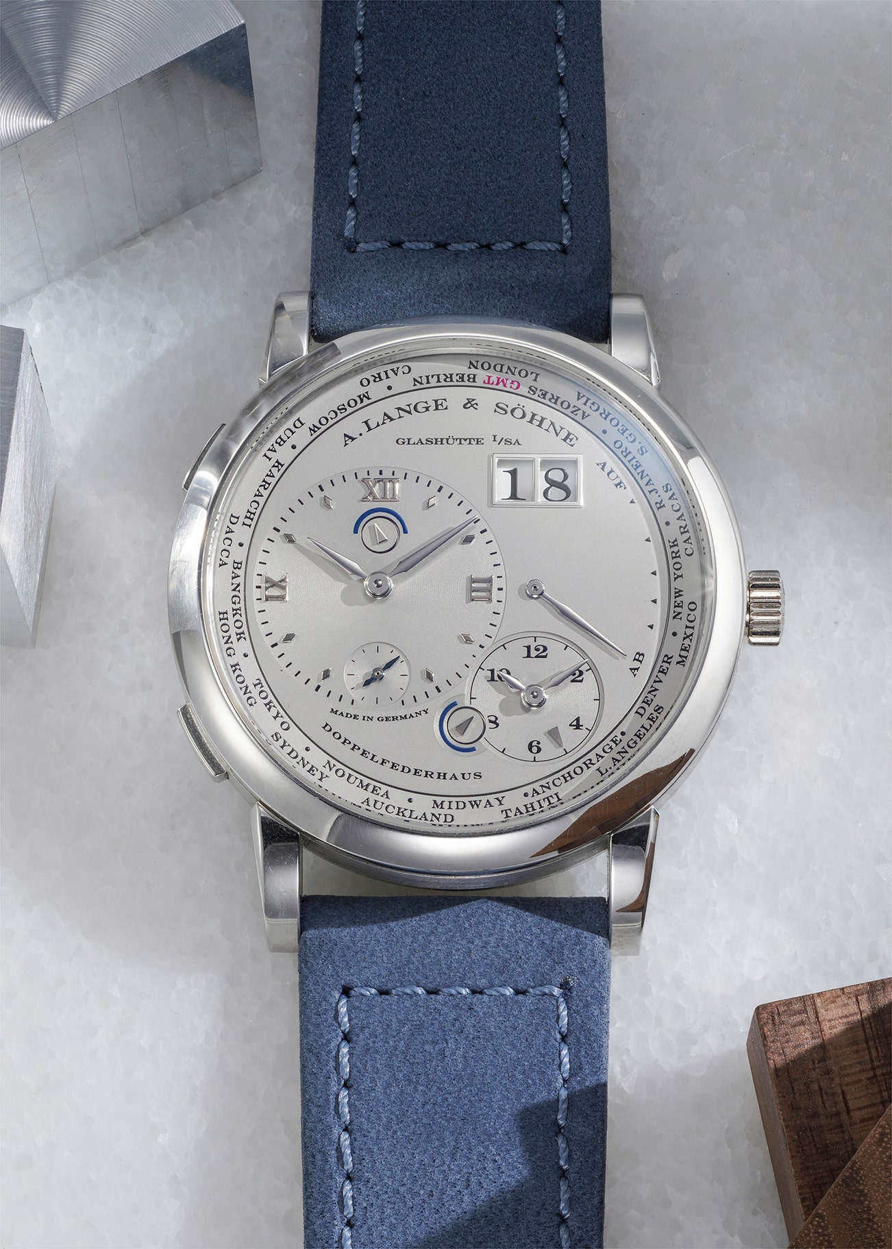 -On the outer rim of the dial, a city ring has been integrated, and the small arrow on the subsidiary dial denotes the city where the second time zone is located. By pressing the pusher at 8 o'clock, the times of all 24 time zones can be called up one after the other.