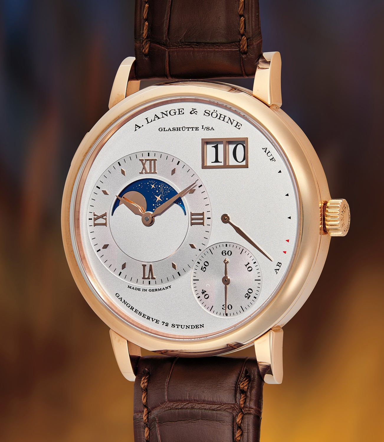 The brand released the Grand Lange 1 model in 2003 with an oversized 41.9mm diameter case. In 2012, Lange redesigned the Grande Lange 1, reducing its diameter to 40.9mm. The Grand Lange 1 Moon Phase, with the updated caliber L095.3, was released in 2014 and included a moon phase sector at 12 o’clock within the offset time display.