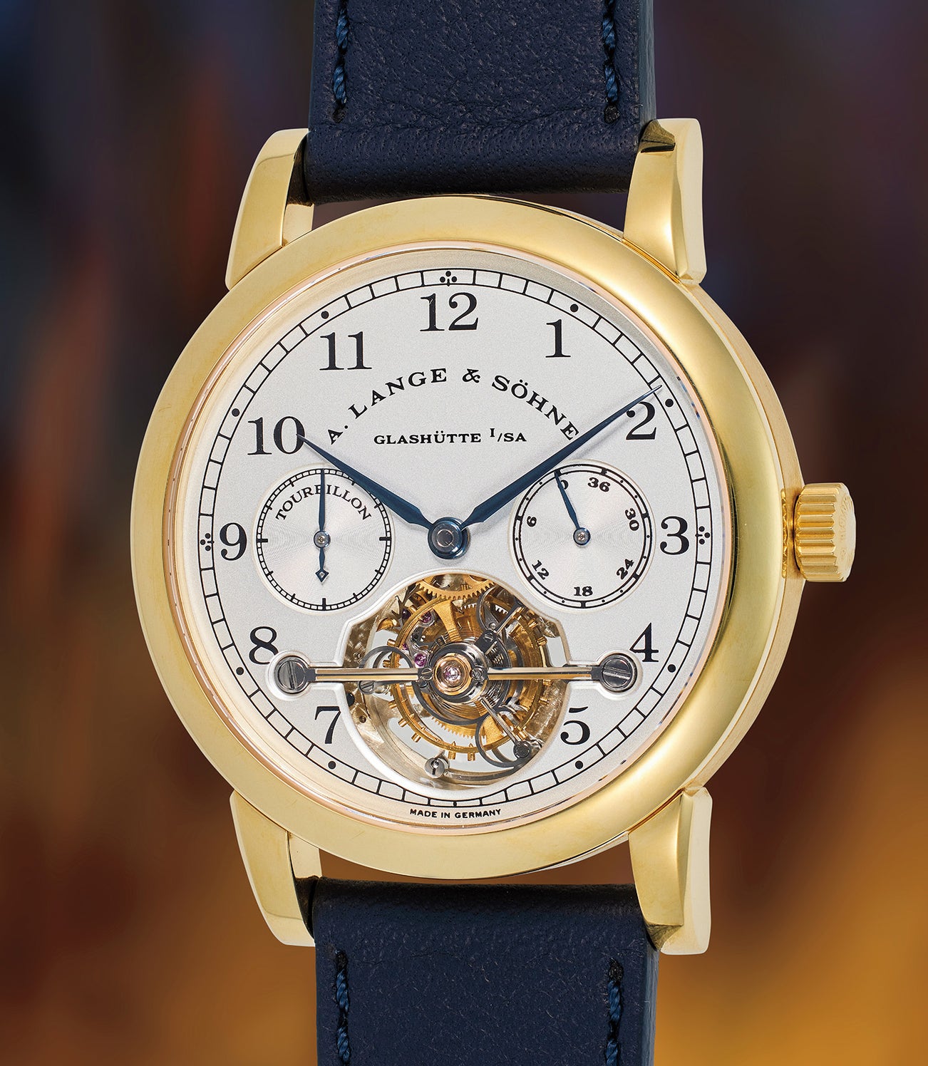 Exceedingly rare and important, the present ref. 701.001 is numbered 15 of the 150 timepieces made in yellow gold. A complete work of art, the Tourbillon Pour le Mérite from circa 1995 of the earliest batch appears not to have aged at all in the intervening nearly three decades since its production. Featuring a gorgeous, symmetrical two register dial surrounded by elegant Arabic numerals and railway track, the arched signature draws your eye to the elegant tourbillon aperture at 6 o’clock. The diamond capped steel tourbillon bridge contrasts harmoniously with the gold tourbillon carriage. Proudly marked “Made in Germany” to represent fine Saxon watchmaking, the inscription is in a sans serif typeface that are only found on early models from the brand, latter designs were later changed to the serif font Engravers MT that is similar to the brand’s logo.