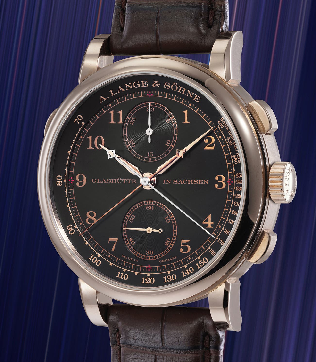 The dial layout is different to other A. Lange & Söhne chronographs as minutes counter and continuous seconds counter are placed vertically.