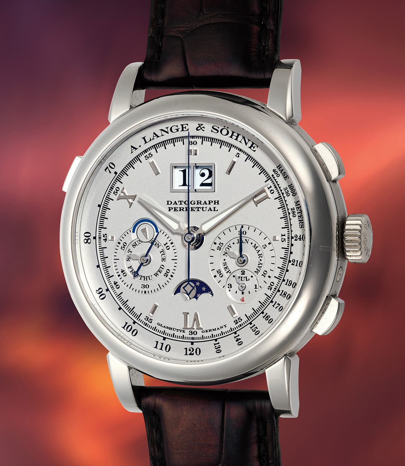 The present example from 2007 is in excellent overall condition and offered with its complete set of accessories. The first generation models, such as the present watch, available in platinum and white gold, featured unique II, VI, X Roman hour markings on the dial, while the second generation in white gold and pink gold were updated with baton numerals. The Perpetual Datograph is one of the brand’s flagship timepieces and was only manufactured for a five year time span with very few being offered publicly. The watch demonstrates the A. Lange & Söhne commitment to excellence in traditional watchmaking, and the historical significance of the brand reaching back over 175 years.
