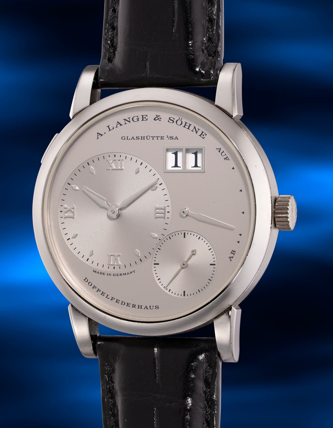 - While preserving the instantly recognizable off‑center dial arrangement and outsized date, it introduced subtle aesthetic refinements that enhanced legibility and visual harmony. Known as the Lange 1 “Stealth”, the present example features a silver dial with a platinum case, giving it a monochromatic appearance and is favored amongst collectors.