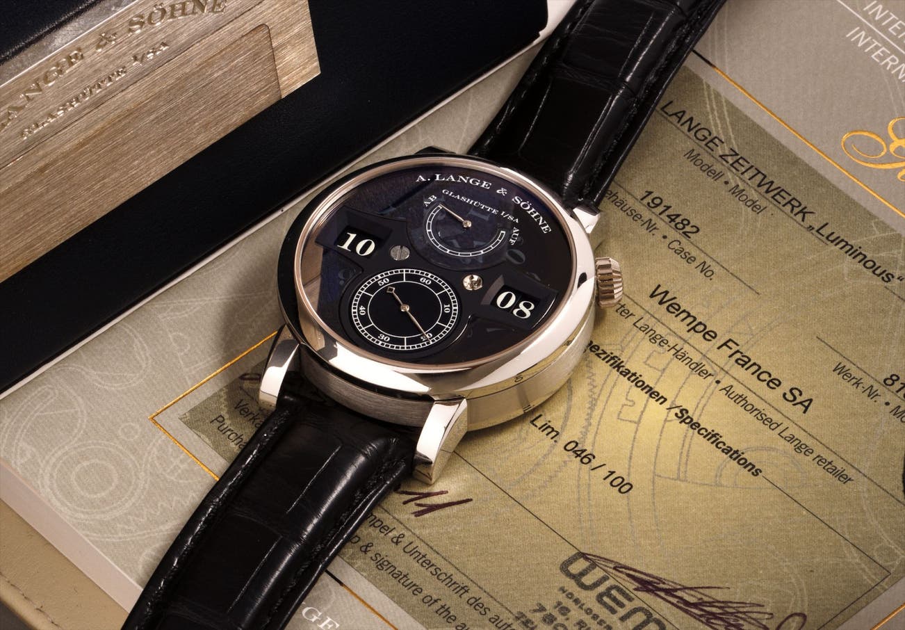 Accompanied by A. Lange & Söhne Proof of Origin confirming launch of the watch in 2010, Guarantee, product literature, original blue leather presentation box, outer packaging and A. Lange & Söhne polish cloth. Further accompanied by Wempe warranty card and company literature.