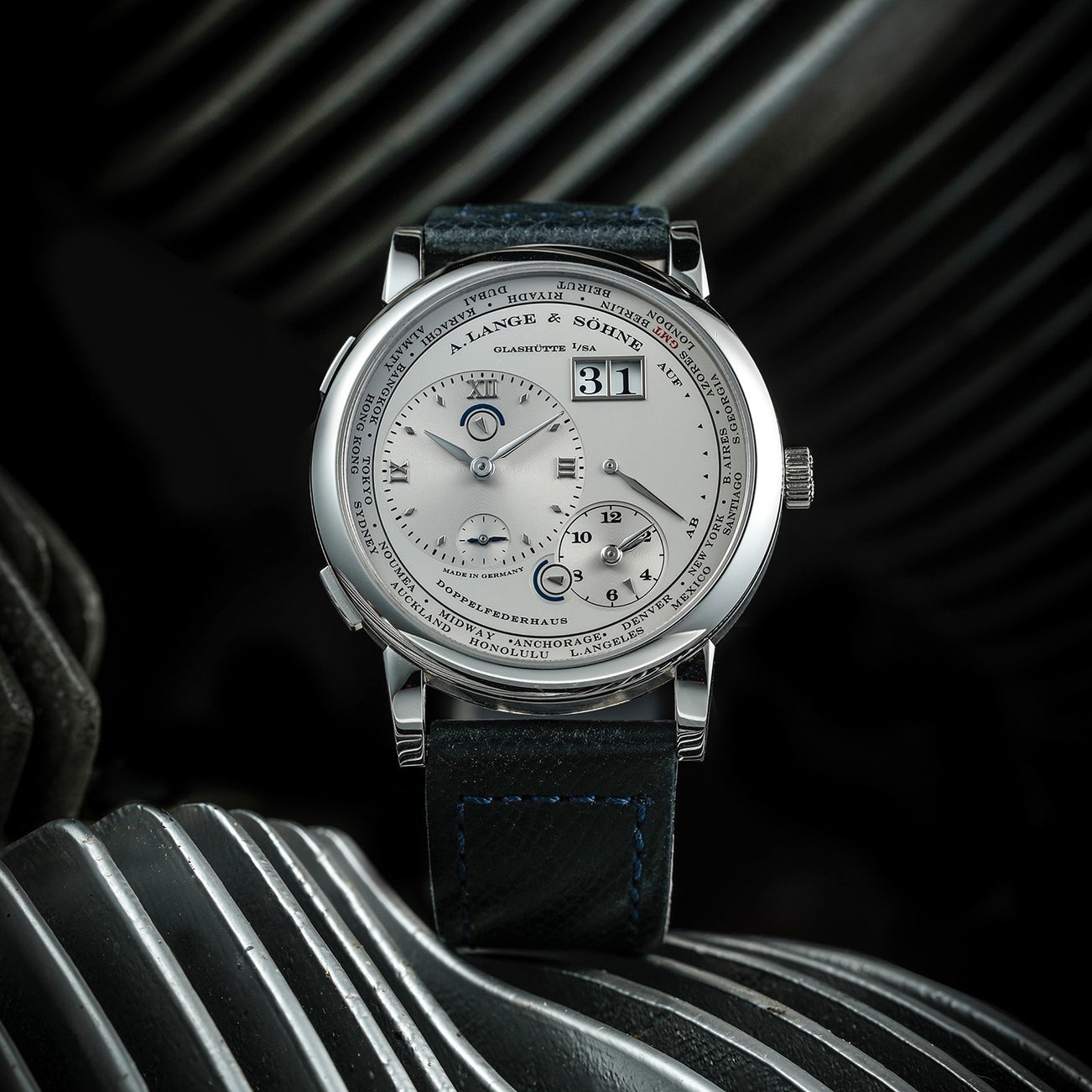 - On the outer rim of the dial a city ring has been integrated and the small arrow on the subsidiary dial denotes the city where the current local time is located. The timepiece also features two equally practical day/night indicators for both local and home time.