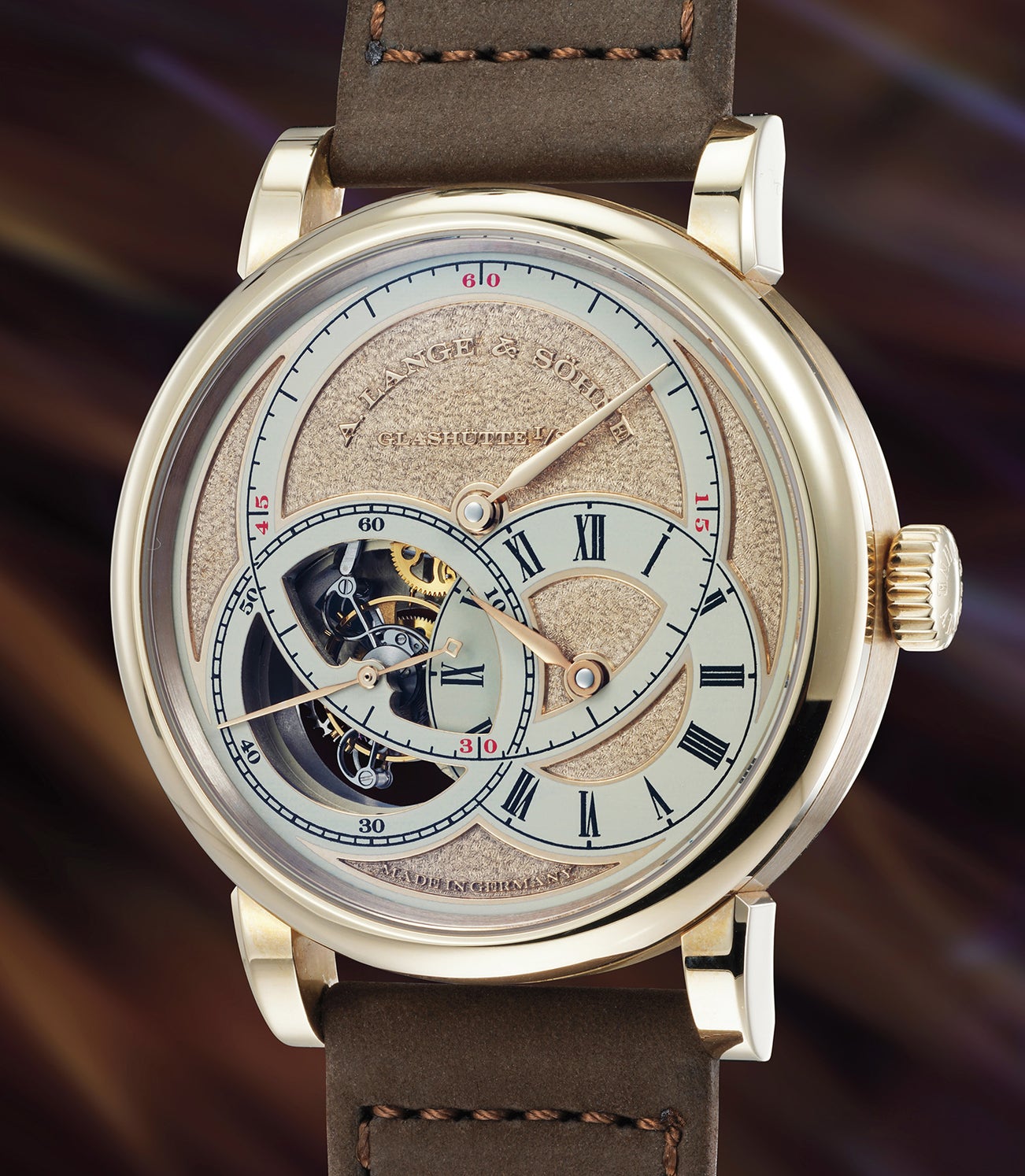 As a follow up to this iconic model, the brand re-imagined the Tourbillon Pour le Mérite in 2011 with a Handwerkskunst dial and a honey gold case, made exclusively in a 15 piece limited edition for Lange boutiques.