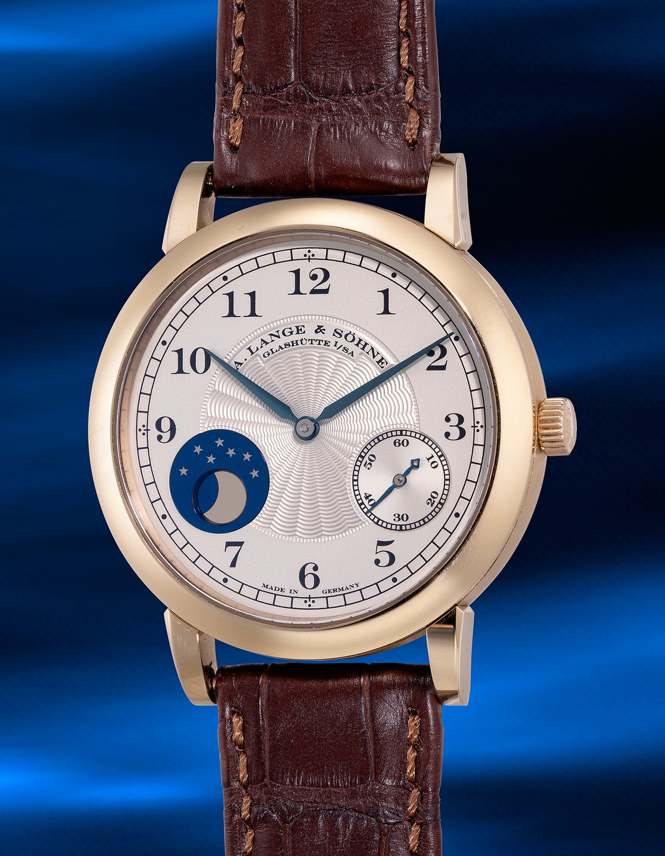 An attractive and rare limited edition honey gold wristwatch with moon phase, numbered 17 of a limited edition of 265 pieces made to commemorate the 165th anniversary of A. Lange & Söhne