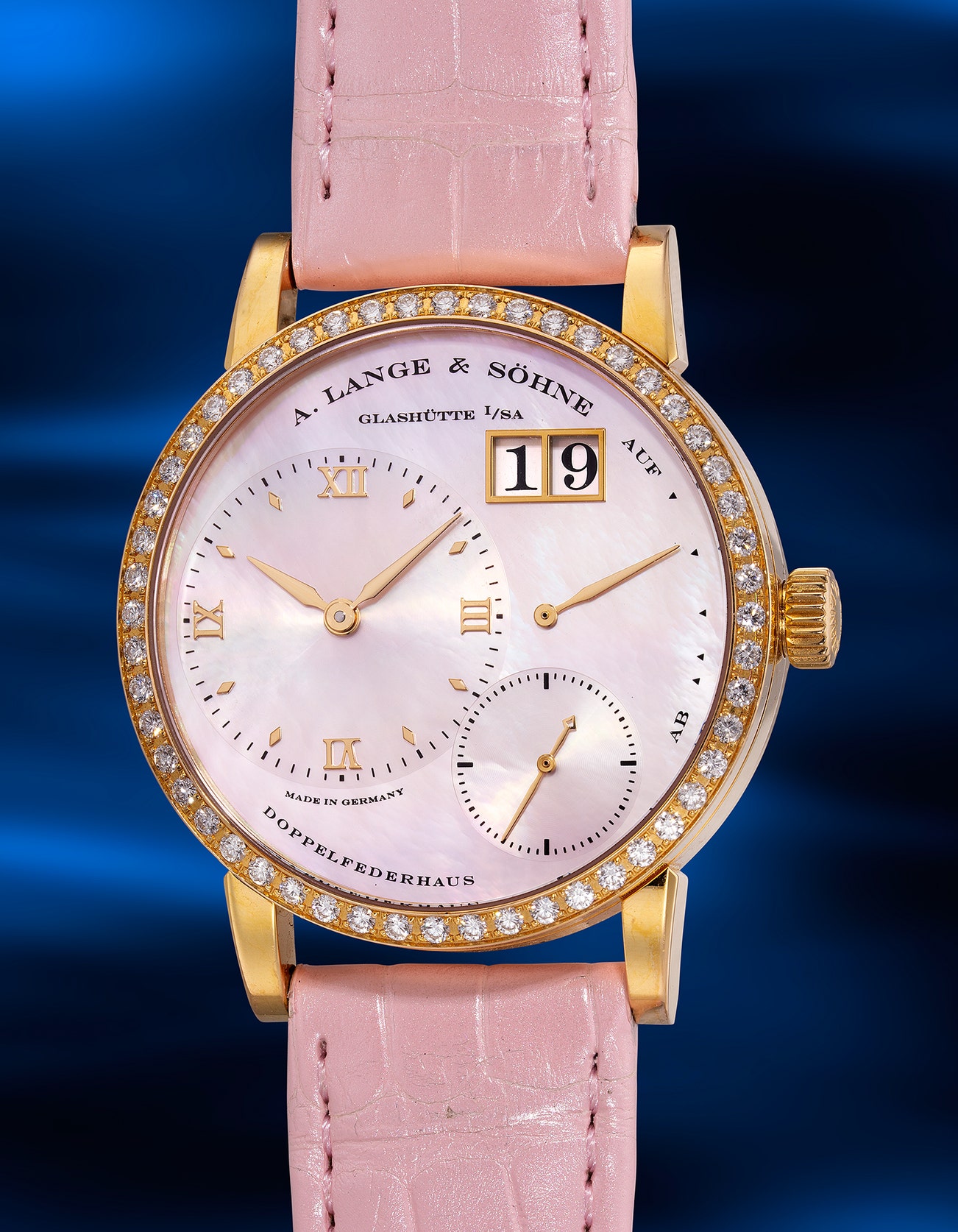 - The current example of the Little Lange 1 Soirée in pink gold is one of the more elegant releases in the lineup. It showcases a lovely pink-mother-of-pearl dial paired with a sparkling diamond-set bezel, giving this timepiece a distinctive charm that sets it apart, thanks to its gem-setting and rarity.