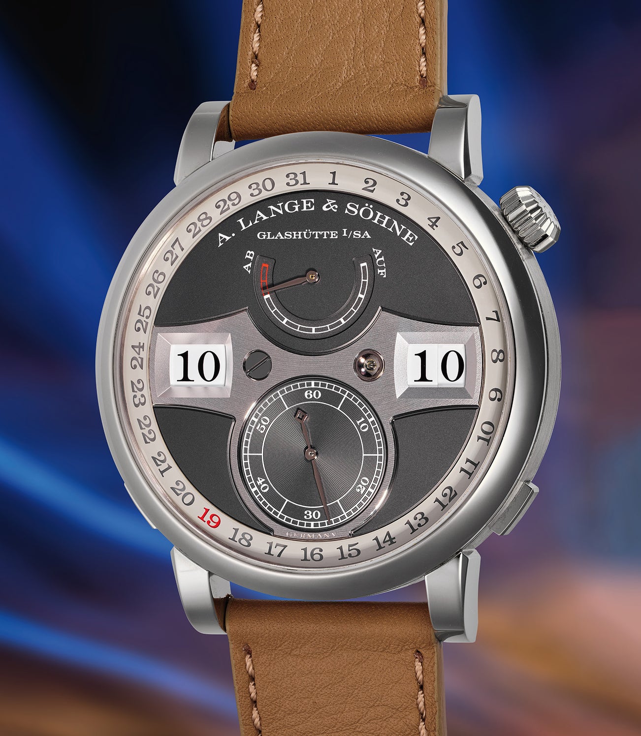 In 2019, the brand introduced the Zeitwerk Date for the tenth anniversary of the model. The wristwatch was encased in white gold with a grey dial and date ring around the outer circumference of the dial. The traditional date hand is removed, giving the dial a less cluttered look with the date now highlighted in red.