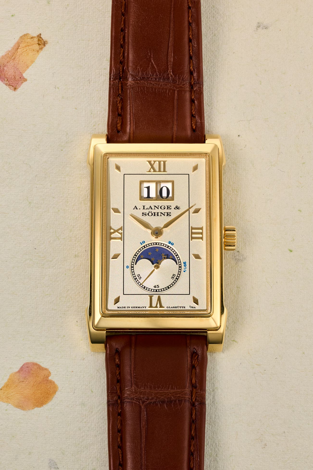 - Released in 2004 in yellow gold (118.021) like the present watch and in pink gold (118.032) these Cabaret models included a moon phase with the big date apertures. The dial layout is in perfect harmony with the rectangular case making it an easily readable and wearable wristwatch. Purchased from an A. Lange & Söhne Boutique in 2024, it is believed to have remained “new old stock” for nearly 20 years before its sale. The present watch is fresh to the market and offered by the original owner. The watch is in near new condition and is complete with its full suite of accessories.