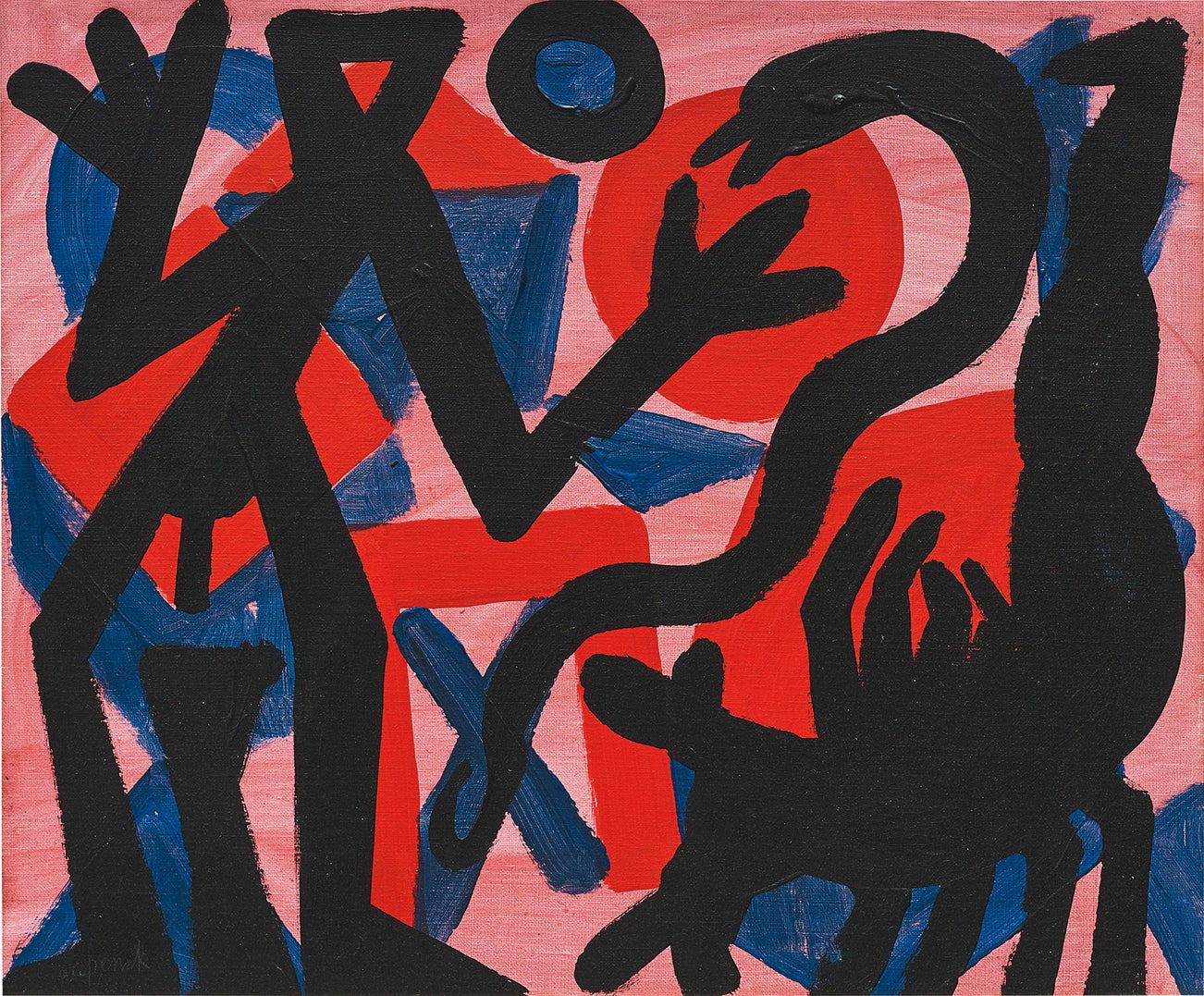 signed 'ar. penck' lower left; further signed and dedicated 'für Beatrice a.r penck' on the reverse; further titled and dated '"ZERSTÖRTE FORM ROT" 2001' on the overlap