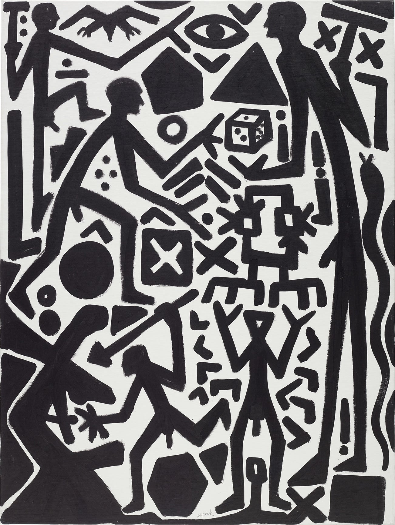 Characteristically simplified in form and ranging from small to large, five anonymous figures traverse A.R. Penck’s AUFSTAND DER SPIELER, 2001, with unruly vigour, identified by the work’s title ‘The Rebellion of the Gamblers’. Surrounded by energetic black strokes carefully devised on a white background, delineating familiar objects such as spears, hammers, an eye and a dice, these pulsating characters exemplify the German artist’s vibrant ‘Standart’ style, heavily informed by the aesthetic of hieroglyphs and cave paintings. ‘Standart’, coined by Penck himself, conflates the English word ‘Standard’ and the German ‘Standarte’, signifying a banner or flag. As such, the umbrella-genre denotes the graphic power of his compositions, but also the political undertones that they bear. The artist furthermore expanded; ‘Every Standart can be imitated and reproduced and can thus become the property of every individual. What we have here is a true democratisation of art’ (A.R. Penck, quoted in Oliver Basciano, ‘A.R. Penck Obituary’, The Guardian, 5 May 2017, online).