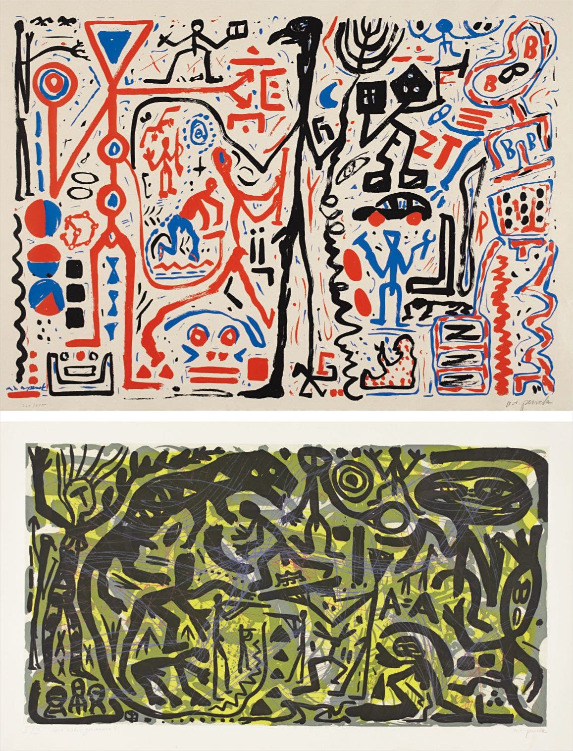 Two prints, including one screenprint in colors and one aquatint in colors, on Arches and Magnani Incisioni paper respectively, with full margins,