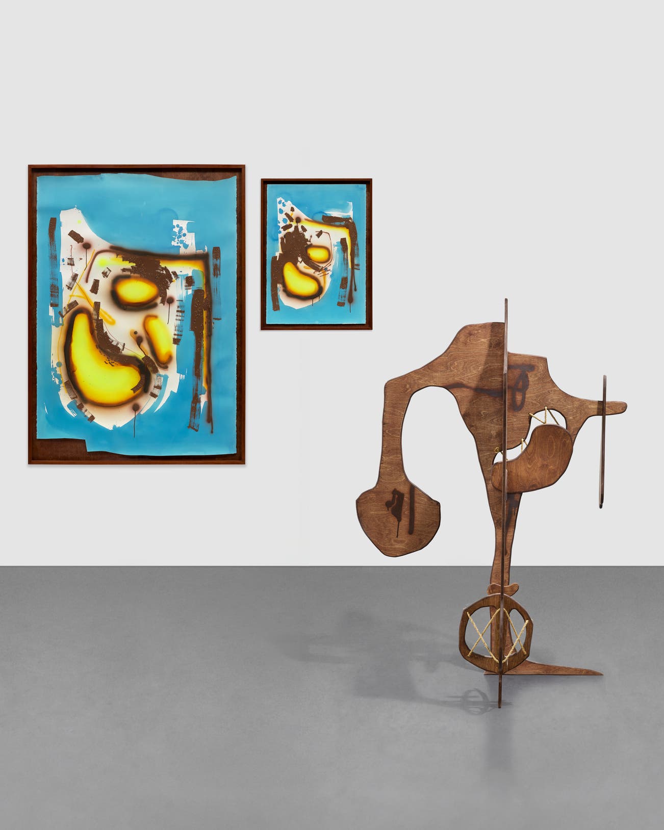 painted wood, rope, ink, gouache and acrylic on paper