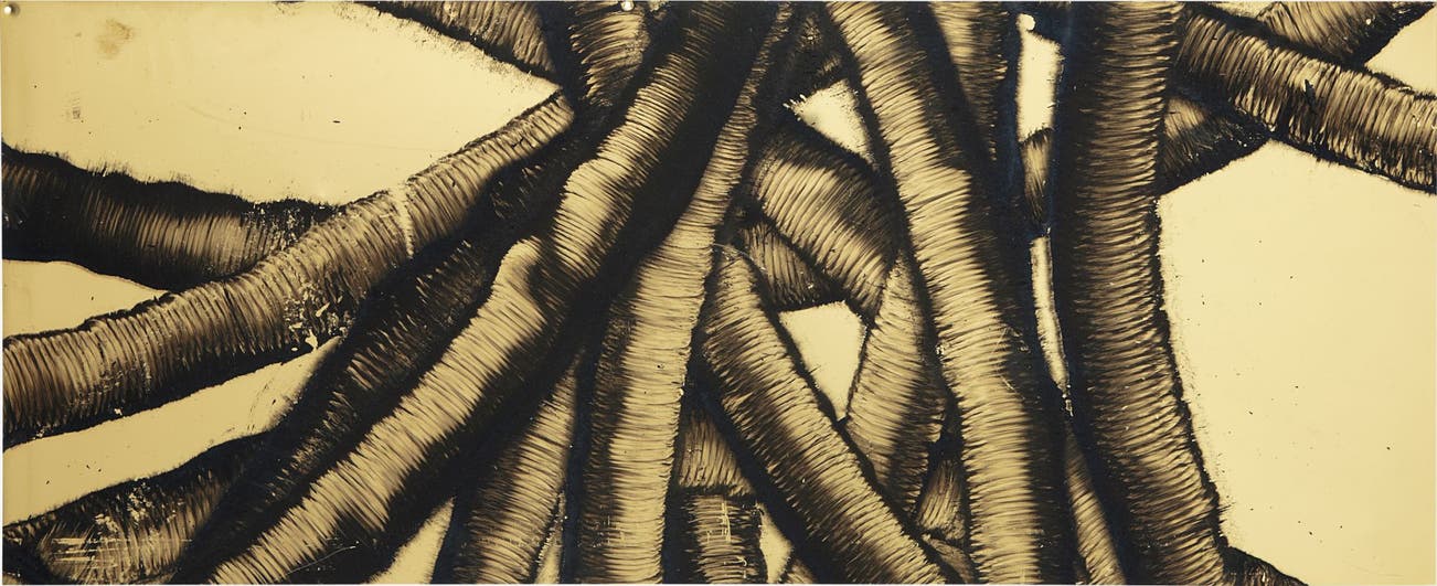 brass panel plated with 24 karat gold, burnt rubber and motor oil