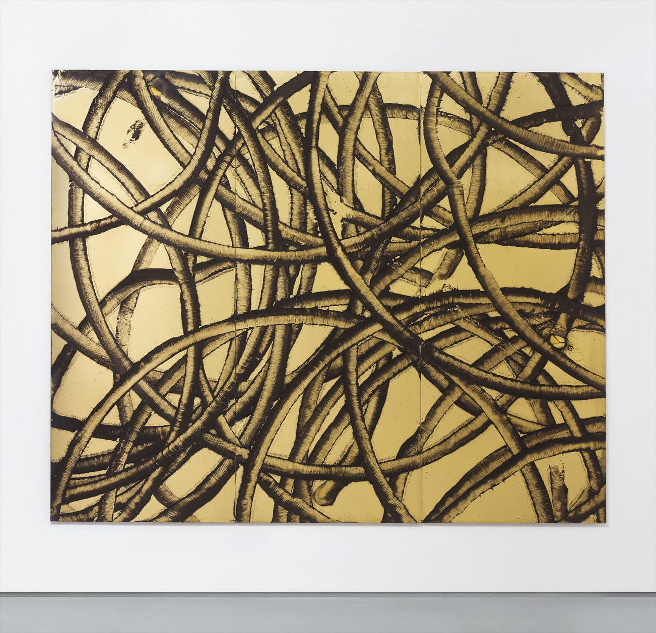 burnt rubber, motor oil on gold-plated brass panel, in three parts