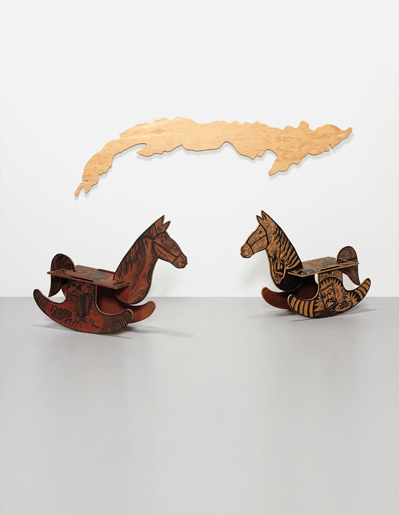 Cuba map 22 x 92 in. (55.9 x 233.7 cm.); each wooden horse 33 x 44 x 13 1/2 in. (83.8 x 111.8 x 34.3 cm.)