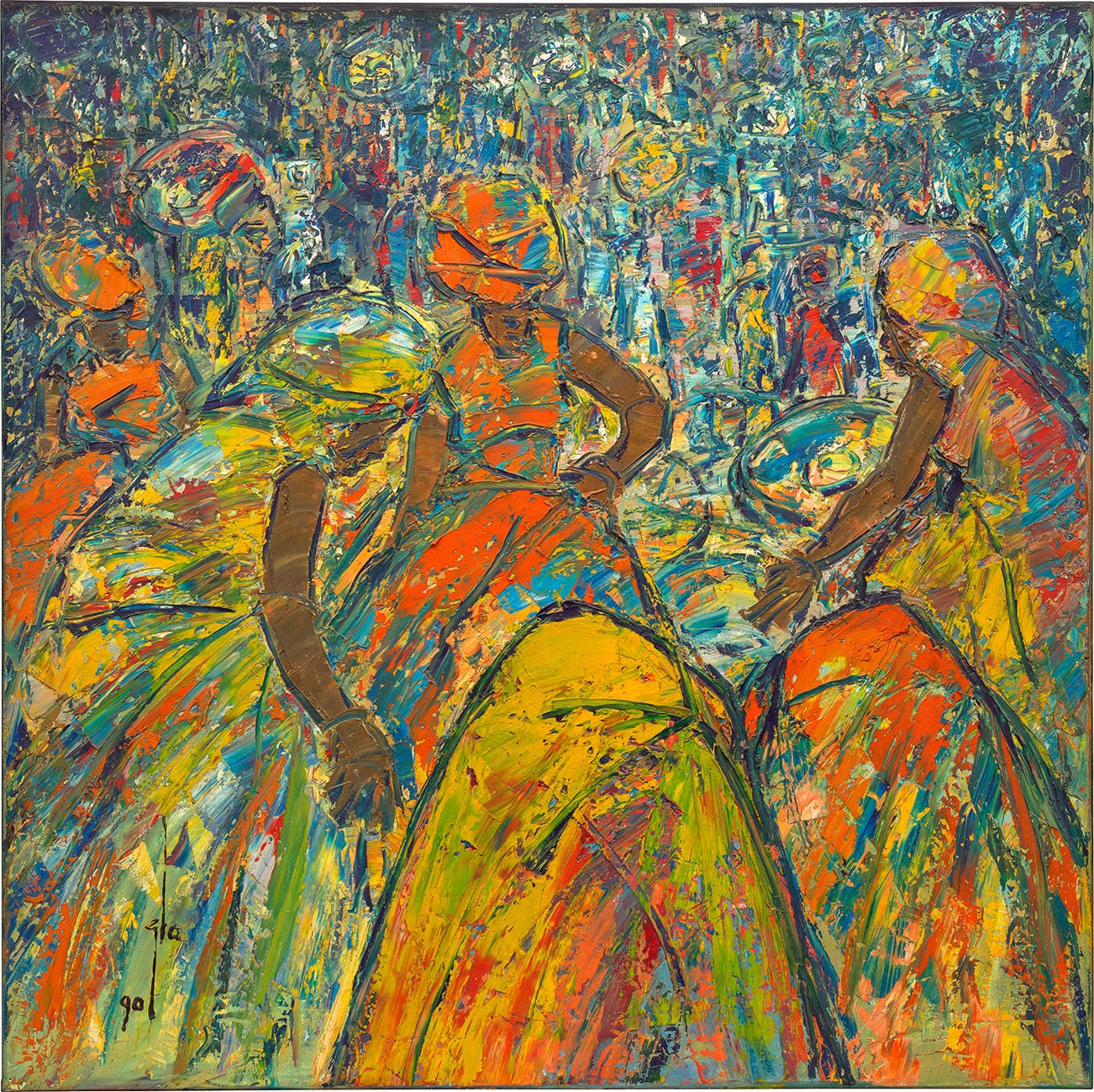 signed 'Ablade Glover' lower left; signed and titled 'Ablade Glover Pot Dealers (Market Forms)' on the reverse