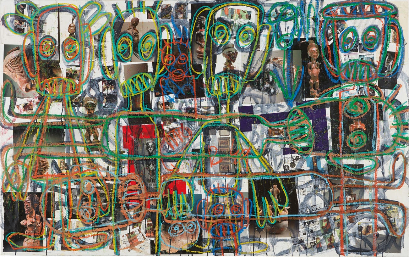 acrylic, oil pastel and paper collage on canvas