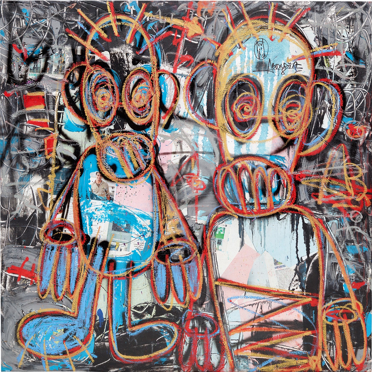 acrylic, printed paper collage and oilstick on canvas
