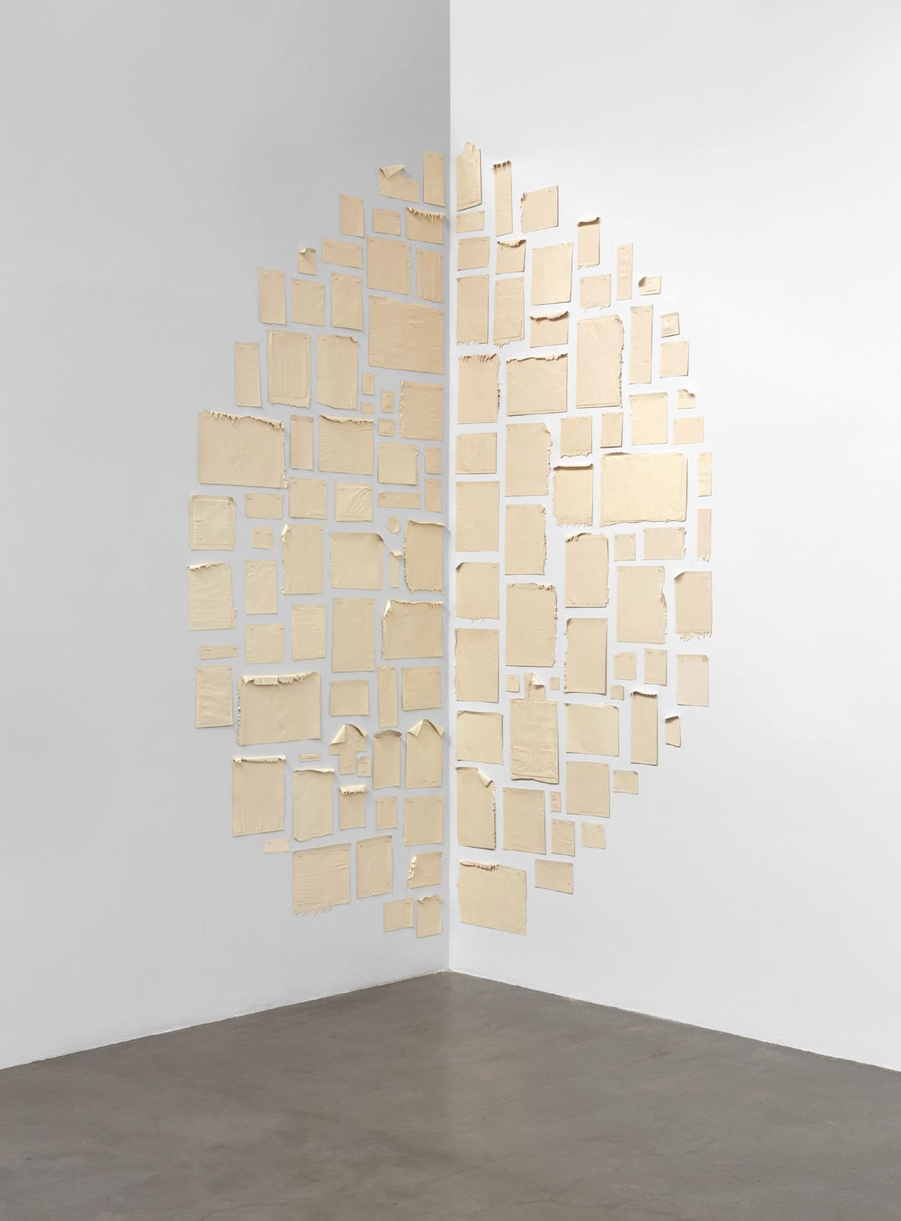 beige acrylic paint on newspaper clippings, cardboard, photographs, drawings, postcards, envelopes, tickets, vouchers, letters, drawings, posters, flyers, cards, recipes, napkins and steel pins, in 128 parts