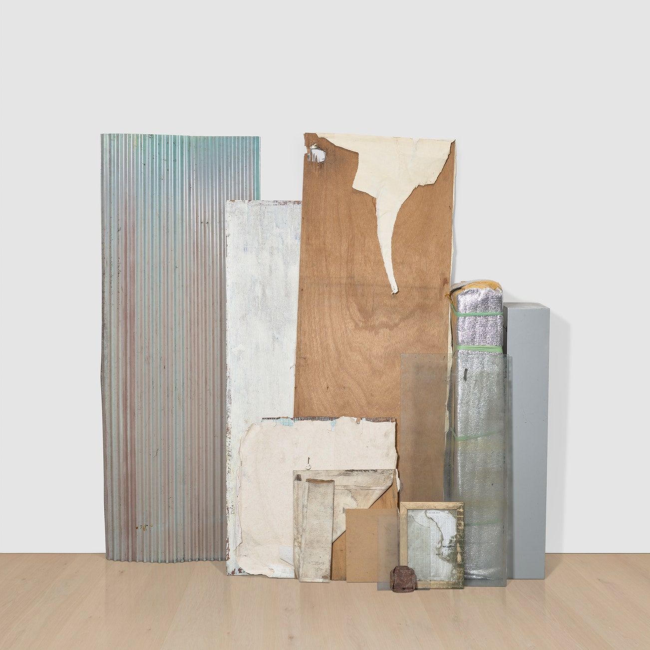sculpture comprising plastic roof boards, luminous signs, isolation cloth, tape, rope, glass, paper, tin can and wooden panels