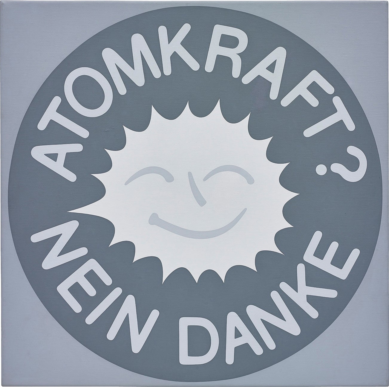 Adam McEwen’s Untitled was painted as part of a series of Atomkraft works based on the ‘Smiling Sun’, the international symbol of the anti-nuclear movement. Over 36 million items displaying the 'Smiling Sun' logo were sold and the statement 'Nuclear Power? No Thanks' was translated into 45 languages making it a ubiquitous icon of the 1970s and 80s. McEwen used the motif to create unique works in varying shades of grey, the larger of which were exhibited at The National Exemplar Gallery in 2013 alongside the lyrics of Nena’s Cold War era protest song 99 Luftballons.